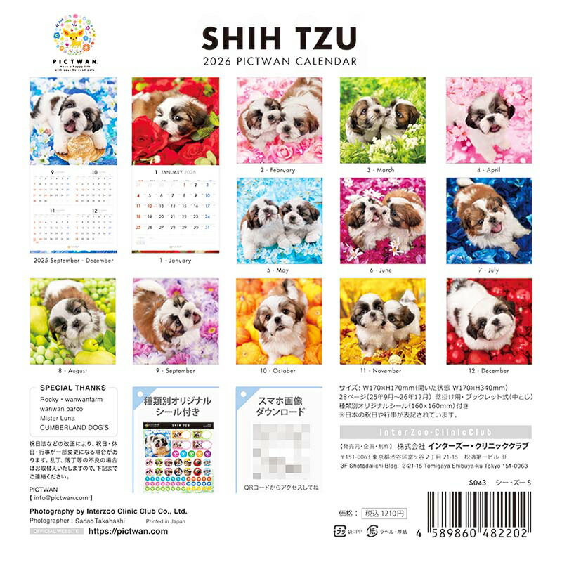 色鮮やかな花々と植物に囲まれた愛らしいシー・ズーの子犬たちのフォトカレンダー! コンパクトなS判(スモールサイズ)なので、玄関やキッチンなどのちょっとしたスペースにも。 ●迫力の大判サイズも一緒にいかがですか? PICTWANカレンダー2026 【L判】シー・ズー はこちら>> 【カレンダー 2,200円以上で送料無料!】 PICTWANカレンダー各種、ご注文合計税込2,200円以上で送料無料になります(システム上、送料が加算されますが、後ほどスタッフからのメールで送料無料に変更させていただきます)。 ※北海道・沖縄は別途、地域別送料がかかります。 ※カレンダー以外の商品を同時にご注文の場合は3,980円以上で送料無料です。 【S判は5冊までゆうパケット可!】(組み合わせ自由) 配送方法で「ゆうパケット」を選び、かごに追加してください。 ・送料は全国一律220円(2冊以上で送料無料) ・北海道・沖縄への別途送料もかかりません。 ・郵便受けへの配達で、お届けまでに1週間ほどかかります。 ・システム上送料が加算されますが、後ほど220円(2冊以上は無料)に変更させていただきます。 ※ゆうパケット配送は代引不可・日時指定不可・他商品同梱不可となります。 ※S判カレンダー以外の商品と一緒に注文された場合は通常の送料がかかります。 機能カレンダー/壁掛け用・ブックレット式(中とじ) サイズサイズ:170×170mm(開いた状態:170×340mm) 枚数28ページ(2025年9月〜2026年12月) 備考日本の祝日や行事が表記されています。 付属品オリジナルシール付き(160×160mm) 原産国日本