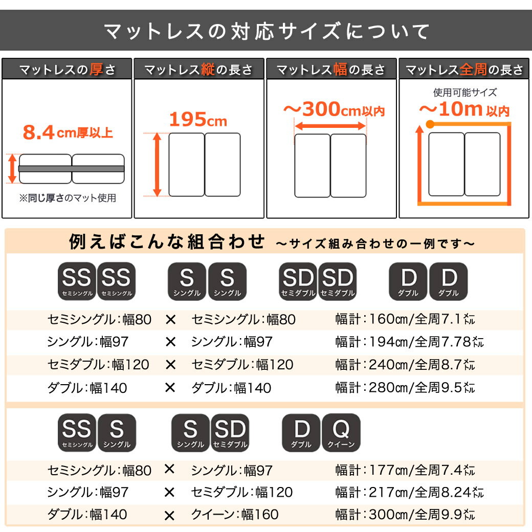 インフォメーション・注意事項 保証期間1年 決済方法について (お買い物ガイド「お支払い方法について」をご確認ください。) 配 送 ※納期表示の異なる商品を同時に購入した場合、納期の遅い商品とまとめて発送する場合がございます。予めご了承ください。 詳細・スペック 商品説明 neruco 隙間パッド・連結ベルト付き隙間パッドは、2枚のマットレスを並べて広々ワイドなマットレスとして使いたい時にマットレスの間にできてしまう隙間やズレを解消するのに便利なアイテムです。■ マットレス間の段差を緩和するスリム&ワイド設計■程よい厚みと柔らかさで寝心地サポート■パッド長さ195cm 標準的なマットレスの長さをカバー■マット同士をしっかり固定する連結ベルト■つなげたマットレス幅計が300cmまで(全周は10mまで)様々なサイズ組み合わせパターンに対応■パッドのカバーは洗濯可能、抗菌防臭加工 サイズ(約) パッド:幅30cm×長195cm×高10.4cm連結ベルト:幅4.2cm×長10m材 質 ●中材:ウレタンフォーム ●側生地 : ポリエステル100%(三層エアーニット ( 抗菌防臭加工) 組 立 完成品 生産国 中国製 梱 包(約) 1個口:20.5×20.5×37.5cm(1.5kg) その他・注意事項 ※マットレスは同じ厚みの製品を使用してください。※使用するベッドフレーム(マットレス落とし込みタイプなど)のデザインや仕様によってマットの連結が難しい場合もございますのでご注意ください。※カバーを洗濯する際は洗濯ネットをご使用ください。※中材のウレタンはお洗濯できません。洗濯の際はカバーから中材を必ず取り外してカバーのみを洗濯してください。 ※商品画像は色合いや素材感が実際の商品と異なる場合がございます。モニター・ディスプレイによっても写り方が変ります。予めご了承ください。【GY】 マットレスを2枚並べて広々と使いたい。マット並べた時にできる気になる隙間にぴったりフィットする「隙間パッド」マットレススペーサー並べたマットレス同士の隙間と段差を解消・マット同士のズレを防いで、寝心地改善! マットレスを2つつなげて子供と一緒に寝たい、広々眠れる”川の字”眠り。カラダに当たるパッド部分は快適な柔らかさをもちながらマットレスとの段差を感じにくい厚み2cmのスリム形状。パッド幅30cm幅広設計でマットの隙間に落ち込みにくく、長さは標準的なマットレスの長さと同じ195cm。マットの端から端までしっかり隙間を埋められます。隙間に差し込む凸部分は約8.4cm、マット間にしっかりと差し込めてズレにくい。マットレスへの取付は、隙間パッドを差し込んで、連結ベルトでしっかりと固定。固定ベルトは着脱やベルトの長さ調整に便利なバックルとアジャスター付きです。連結ベルトと隙間パッドとの接続は、面ファスナー接着のダブルバンドを通すことで安定感がさらにアップ。パッド部分のカバーは、抗菌防臭加工を施したソフトな肌触りの3D(立体)ニット生地を採用。ネルコのロゴでもある羊のマークがかわいいアクセントに。パッド部分のカバーは中材を取り外してご家庭でお洗濯可能いつも清潔に安心してお使いいただけます。隙間パッドは、連結ベルトを装着した状態のまま、隙間パッド部分のみを外すことができるので、カバーをお洗濯する時にとっても便利です。nerucoの隙間パッド(マットレススペーサー)は、2枚のマットレスを並べて1枚の広いマットレスとして使用する時に便利なアイテムです。マットレスを並べただけでは隙間・段差・マットレスのエッジのかたさなどが気になります。そのちょっとした違和感を埋めることで快適に広々とストレスフリーに眠ることができます。適度なクッション性をもつパッド部分は、長さは標準的なマットレスサイズと同じ195cm、幅はワイドな30cm幅。マットレス同士のズレを防ぎマットレス同士をしっかりと結合する連結ベルトは長さ10m。並べたマットの全周10m以内の幅広いマットレスサイズの組み合わせに対応します。 パッド部分のカバーは取り外して家庭で洗濯できるため、いつも清潔で心地よい睡眠を楽しめます。※隙間パッド(連結ベルト付)の販売ページです