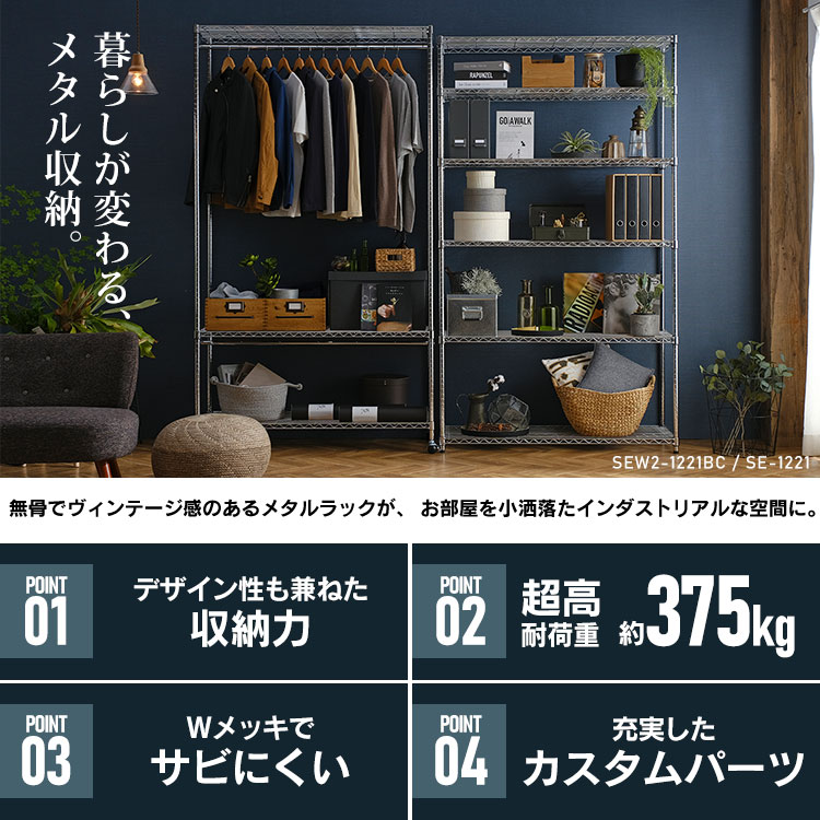 ※2024年1月24日にメーカーが移管になりました。品質は変わりません。暮らしが変わる、メタル収納。無骨でヴィンテージ感のあるメタルラックが、お部屋を小洒落たインダストリアルな空間に。◆POINT01.デザイン性も兼ねた収納力光沢あるスチール素材が、お部屋の雰囲気をユーズド風に昇華。洋服や雑貨収納も、お店のような見栄えに。【収納力抜群、ワイドタイプが新登場】大容量でもう収納には困らない、幅1500mmのワイドタイプ。背板のないオープンタイプなので圧迫感もなく開放的。【組み換えOK】約2.5cm間隔で棚板の高さ調整が可能。収納物に合わせてムダなく設定できます。◆POINT02.超高耐荷重375kg頑丈で丈夫なつくりでガレージや物置使用も余裕の、超高耐荷重仕様。倉庫などで物置としての使用にも最適。耐久性と通気性を兼ね備えたワイヤー構造。棚板1枚あたり、約75kg。◆POINT03.Wメッキ加工でサビにくい耐久性に優れており、他と比べて圧倒的なサビにくさ。水に強いので、プランターラックとしても。またオフィス使用にも活躍。【アイリスのメタルラックは、圧倒的にサビに強い、ニッケルメッキ×クロームメッキ】サビや腐食に強い「ニッケルメッキ」に、さらにサビやキズに強い「クロームメッキ」を重ねることで防サビ強化。他との違いは、圧倒的な「ニッケルメッキ」の厚さ。美しさを保ったまま、永くご愛用頂けます。◆POINT04.充実したカスタムパーツ豊富な別売りパーツをお好みで揃えて、便利なマイラックづくり。用途に合わせてラックをカスタムして、より機能的に。★お客様組立★●商品サイズ(cm)幅約150×奥行約46×高さ約179(アジャスター含む)●耐荷重棚板(1枚あたり):75kg全体:375kg※耐荷重は測定値であり、保証値ではありません。●主要材質棚板・ポール:スチール(クロムメッキ)棚板固定部品:ABS樹脂アジャスター:スチール、ナイロン樹脂●必要工具ソフトハンマー(プラスチック、木ゴム製等)(検索用:スチールラック・メタルラック・ラック・金属製ラック・組立ラック・アイリスラック・ワイヤーラック・スチール家具・棚・収納・オフィス・収納・リビング・キッチン・倉庫・4967576551786・アイリスオーヤマ) 最強翌日配送対象商品に関するご案内 最強翌日配送対象商品・対象地域に該当する場合は最強翌日配送マークがご注文カゴ近くに表示されます。 最強翌日配送可能なお支払方法は【クレジットカード、代金引換、全額ポイント支払い】のみとなります。 下記の場合は最強翌日配送対象外となります。 ●15点以上ご購入いただいた場合 ●時間指定がある場合 ●ご注文時備考欄にご記入がある場合 ●決済処理にお時間を頂戴する場合 ●郵便番号や住所に誤りがある場合 ●最強翌日配送対象外の商品とご一緒にご注文いただいた場合 ●お届け先住所文字数が40文字以上の場合お届け先が沖縄・離島の場合、お届け日時のご希望に沿えない場合がございます。予めご了承ください。 ★ご注文前のよくある質問についてご確認下さい★ ①のご購入はこちら▶ ②のご購入はこちら▶ ①のご購入はこちら▶ ②のご購入はこちら▶ ③のご購入はこちら▶ ④のご購入はこちら▶ ①のご購入はこちら▶ ②のご購入はこちら▶ ③のご購入はこちら▶ 他のサイズはこちら 高さ210×幅120 高さ210×幅150 ▼雑草が生える前の今がチャンス!