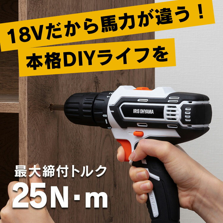 組み立て家具にオススメ。最大締付トルク25N・m。ビット10本付き。18Vだから馬力が違う。プロも使う本格派。使いやすいコンパクトボディ。握りやすさ抜群の滑りにくいソフトグリップ。POINT1 スピード調節回転スピードはツマミで2段階切り替え可能。ネジを入れる素材に合わせて、高速と低速の2段階にスピードを切替え。さらに、トリガーで細かなスピード調整が可能。速さを調節しながらネジを真っ直ぐ締められる。POINT2 クラッチ機能18段階のトルク調節、さらにドリルモードが設定可能。トルク(締め付けの強さ)は豊富な18段階。素材にぴったりの強さで作業でき、板などが割れるのを防ぐ。設定したトルクの強さに達すると、空回りしてネジの締めすぎを防止。ネジ穴が潰れるのを防ぐ。POINT3 スリムグリップ握りやすいスリムグリップ。持ちやすさと安定感が魅力のグリップは直径約35mm。女性の手のひらにも収まるサイズ。POINT4 LEDライトLEDライトで暗い部分の作業も快適。回転と同時にライトON。POINT5 どこでも使えるバッテリータイプだから、ネジの打ちにくい場所や高い場所、外での作業にも。※バッテリーは付属しておりません。POINT6 多彩なビット一家に一台あれば安心。プラスビット(PH1/PH2×2本/PH3)4本、マイナスビット(4/5/6mm)3本、六角ビット(H4/H5/H6)3本のセット。ビットを差し込み、ビットチャックを回して締めるだけで取付完了!付属のビットはもちろん、市販の電動ドライバ用ビットも使用できる。アイリスオーヤマの電動工具・園芸機械シリーズなら【18Vバッテリーを使いまわせる】。プロも使うドライバドリルで、本格的なDIYライフを。●商品サイズ(cm)幅約19.2×奥行約7.4×高さ約19●質量約900g●定格電圧DC 18V●最大チャック把握経10mm●使用可能なビットサイズ直径1〜10mm(六角/丸軸対応)●無負荷回転数(min-1[回/分])低速:0-450min-1高速:0-1350min-1●最大トルク25N・m●付属品ビットセット(10種)※本体のみとなります。充電池・充電器は別売りです。(検索用:ドライバードリル・ドリルドライバー・ドリル・ドライバ・電動・電気・充電式・18v・電動・工具・DIY・本体・バッテリー別売り・充電器別売り・4967576545280・アイリスオーヤマ) 最強翌日配送対象商品に関するご案内 最強翌日配送対象商品・対象地域に該当する場合は最強翌日配送マークがご注文カゴ近くに表示されます。 最強翌日配送可能なお支払方法は【クレジットカード、代金引換、全額ポイント支払い】のみとなります。 下記の場合は最強翌日配送対象外となります。 ●15点以上ご購入いただいた場合 ●時間指定がある場合 ●ご注文時備考欄にご記入がある場合 ●決済処理にお時間を頂戴する場合 ●郵便番号や住所に誤りがある場合 ●最強翌日配送対象外の商品とご一緒にご注文いただいた場合 ●お届け先住所文字数が40文字以上の場合お届け先が沖縄・離島の場合、お届け日時のご希望に沿えない場合がございます。予めご了承ください。 ★ご注文前のよくある質問についてご確認下さい★ ▼雑草が生える前の今がチャンス! ▽こちらをクリック