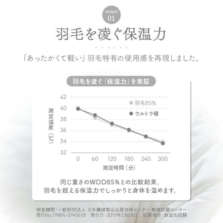 予告なくリニューアルとなる場合がございます。商品名称の変更が発生しておりますが、商品仕様に変更はございません。 ウルトラ暖の繊維は、羽毛の繊維構造の研究を踏まえ、様々な特性の異なる繊維を独自の配合でブレンドし、人工的に疑似羽毛を作り出しふとん内部に空気層を作り高い保温力を実現しています。 ご家庭の洗濯機で洗えて、いつも清潔にご利用いただきます。 ●商品サイズ(cm) 幅約150×奥行約210×高さ約4.5 ●商品重量 約2.1kg ●材質 側生地:ポリエステル100% 詰め物:ポリエステル100%(ウルトラ暖100%) ※当商品はお取り寄せ品の為、在庫の確認及び商品のお届けまでお時間を頂く場合がございます。 また、商品がメーカーにて完売となっていた場合、キャンセル又は注文内容の変更をお願いいたしております。 予めご了承くださいますようお願いいたします。 ■こちらの商品はアイリスプラザがセレクトしたオススメ商品です。 (検索用:暖かい・洗える・無臭・人工羽毛・軽い・冬・布団・4991150962903・4991150962897) 最強翌日配送対象商品に関するご案内 最強翌日配送対象商品・対象地域に該当する場合は最強翌日配送マークがご注文カゴ近くに表示されます。 最強翌日配送可能なお支払方法は【クレジットカード、代金引換、全額ポイント支払い】のみとなります。 下記の場合は最強翌日配送対象外となります。 ●15点以上ご購入いただいた場合 ●時間指定がある場合 ●ご注文時備考欄にご記入がある場合 ●決済処理にお時間を頂戴する場合 ●郵便番号や住所に誤りがある場合 ●最強翌日配送対象外の商品とご一緒にご注文いただいた場合 ●お届け先住所文字数が40文字以上の場合お届け先が沖縄・離島の場合、お届け日時のご希望に沿えない場合がございます。予めご了承ください。 ▼カテゴリーから探す▼ 冬物家電 加湿器 》 ホットカーペット 》 ヒーター 》 ふとん乾燥機 》 カイロ 》 冬物寝具 毛布 》 ラグ・カーペット 》 敷き・掛け布団 》 羽毛布団 》 こたつ布団 》 布団カバー 》 敷きパッド・ベッドシーツ 》 ▼雑草が生える前の今がチャンス! ★あなたの眠りをもっと快適に★ ★新商品の布団乾燥機をチェック★