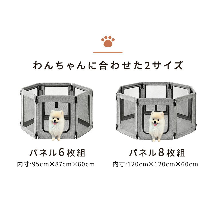 小型犬でも脱出しにくい!洗える折りたたみペットサークル[Ruffmew ラフミュー]うちのこといっしょ。◆大切な家族を、あんしんの空間へ万が一の災害時、避難所で過ごすときに。お留守番をするときに。お客さんの訪問や旅行のときに。◆わんちゃんの体格に合わせた2タイプ【Mサイズ】内寸:95cm×87cm×60cm/パネル6枚組【Lサイズ】内寸:120cm×120cm×60cm/パネル8枚組◆シーンに合わせて自由にレイアウトペットの成長や用途に合わせて、自由にレイアウト変更可能。隙間が小さく、わんちゃんが挟まりにくい安心設計。くるっと面ファスナーを付けるだけ!設置カンタン。閉じる:外側にファスナーが付いている為わんちゃん自身が開けにくい開ける:ファスナーを使用しない場合は面ファスナーで上部に固定可能◆わんちゃんも安心!PVCメッシュ素材×スチールタイプかわいいお顔がよく見える!わんちゃんがなめても安心、破れにくいPVCメッシュ素材採用はぶつかっても体への衝撃を抑え、スチールタイプだから倒れにくい。◆軽量持ち運びしやすい質量感。◆コンパクト収納使用後はじゃばら式に折りたたみ可能。ちょっとした隙間に収納できるコンパクトサイズ。◆出入りスムーズ高さが60cmの為、出入りスムーズ。わんちゃんが飛び出しにくく安心。◆洗濯ラクラク、いつでも清潔にフレームからカバーを取り外すことで、洗濯機で丸洗い可能。※洗濯機使用時は、洗濯ネットを使用ください。※色移りの恐れがありますため他の洗濯物と分けてお洗いください。<Mサイズ/六角形 AOPS-6P>●製品サイズ(cm)(六角形組み立て時)幅約98×奥行約90×高さ約60●内寸(cm)(六角形組み立て時)幅約95×奥行約87●入口サイズ(cm)幅約35×高さ約38<Lサイズ/八角形 AOPS-8P>●製品サイズ(cm)(八角形組み立て時)幅約123×奥行約123×高さ約60●内寸(cm)(八角形組み立て時)幅約120×奥行約120●入口サイズ(cm)幅約35×高さ約38<共通>●主要材質生地:ポリエステル100%(裏:ポリウレタン樹脂コーティング)メッシュ部分:ポリエステル、PVC/パイプ:金属(鋼)(エポキシ樹脂塗装)(検索用:枚数選べる・ペットサークル・ペットケージ・6面・8面・パネル式・洗える・折りたたみ・軽量・コンパクト・ペットフェンス・連結型・安全・お出かけ・避難用・小型犬用・Ruffmew・ラフミュー・4967576774468・4967576774475・アイリスオーヤマ)最強翌日配送対象商品に関するご案内 最強翌日配送対象商品・対象地域に該当する場合は最強翌日配送マークがご注文カゴ近くに表示されます。 最強翌日配送可能なお支払方法は【クレジットカード、代金引換、全額ポイント支払い】のみとなります。 下記の場合は最強翌日配送対象外となります。 ・15点以上ご購入いただいた場合 ・時間指定がある場合 ・ご注文時備考欄にご記入がある場合 ・決済処理にお時間を頂戴する場合 ・郵便番号や住所に誤りがある場合 ・最強翌日配送対象外の商品とご一緒にご注文いただいた場合 ・お届け先住所文字数が40文字以上の場合★当店おすすめペット用品★気になるアイテムをクリック! 掃除がしやすい紙のねこ砂! しっかり固まる鉱物のねこ砂! コスパ最強!薄型ペットシーツ 驚きの吸収量! 厚型ペットシーツ ▼雑草が生える前の今がチャンス! ▼おすすめのペット特集はこちら!▼