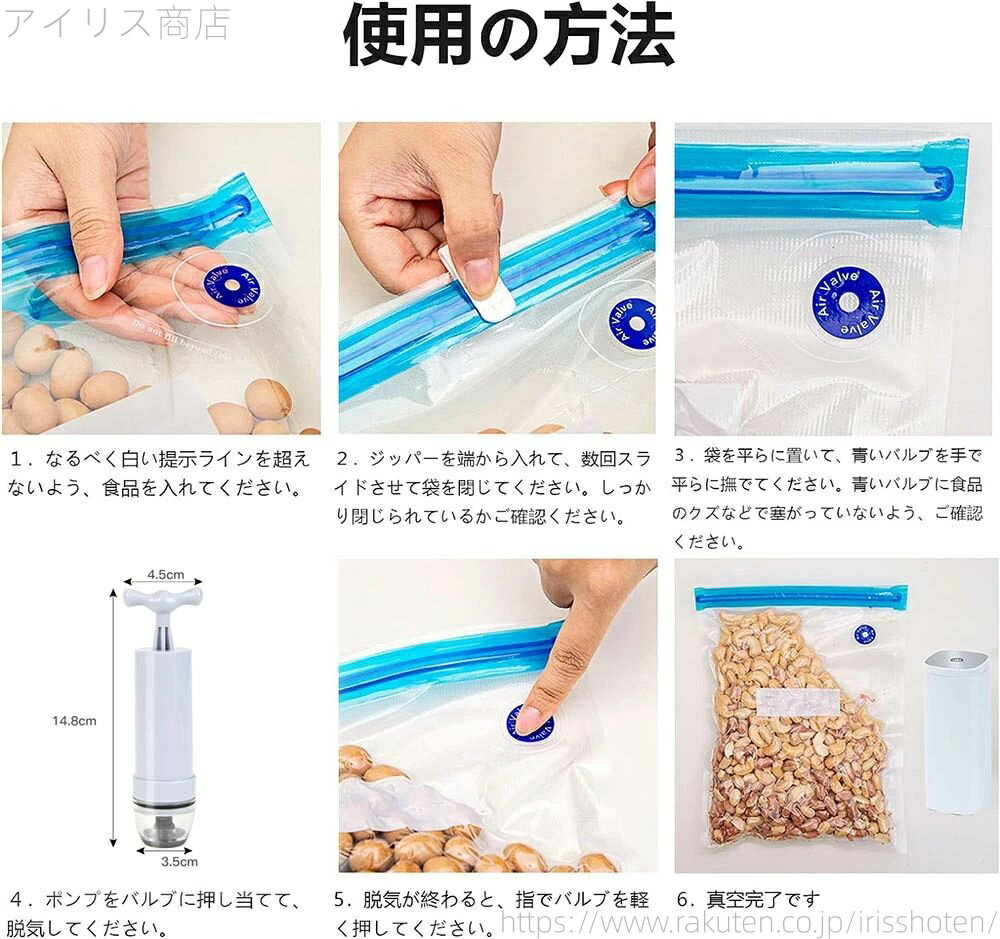 【セット内容】真空保存袋x20枚、ポンプ サイズ:22*21 cm *5枚、26*28 cm *5枚 、26*34 cm *5枚 、30*34 cm*5枚、 【強い密閉性】専用密封袋が作った真空状態により、食品の腐敗、酸化、変質などを防げ、食品の保存に最大限の便利さをご提供できます。本製品は、食品の新鮮度を3〜5倍に延長し、食物の元の味と色を保留することができます。新しいバルブ、電動ポンプと合わせてより楽に真空パックができる。*ご注意:バルブ部分を破れたり、剥がしたりしないでください。真空できない恐れがあります。 【重複利用可能】製品に付属している真空パック袋はBPAフリーで、PA&PE材質を採用しました。お手入れは簡単で、重複利用も可能です。そのほか、環境にやさしく、衛生的です 【二重チャック】真空パック袋は二重チャックの設計のため、密封性が更に高くなります。空気を最大限に防いだため、食物の保存期間を延長し、匂いを通せないことができます当店は他の店舗と在庫を共有し、商品の販売をおこなうとおりますため、ご注文をいただいた商品が在庫切れの状態になっている可能性をご承知おきください。通常の商品は発送まで約5日間を予想しておりますが、発送前には全ての商品を精密に検査いたしますが、万一商品の汚損・破損・故障や在庫不足の状況が発生した場合は、当店より3営業日以内に電話または電子メールにてご連絡いたします。その際はご不便をおかけいたしますが、ご了承のほどよろしくお願いいたします。当店は他の店舗と在庫を共有し、商品の販売をおこなうとおりますため、ご注文をいただいた商品が在庫切れの状態になっている可能性をご承知おきください。通常の商品は発送まで約5日間を予想しておりますが、発送前には全ての商品を精密に検査いたしますが、万一商品の汚損・破損・故障や在庫不足の状況が発生した場合は、当店より3営業日以内に電話または電子メールにてご連絡いたします。その際はご不便をおかけいたしますが、ご了承のほどよろしくお願いいたします。