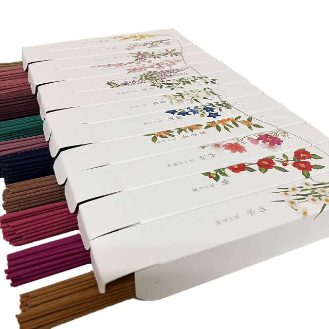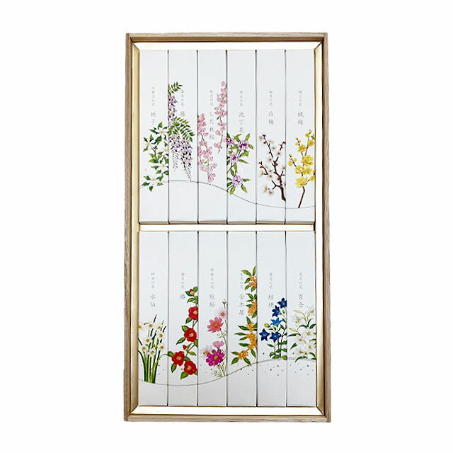 1月から「蝋梅」「白梅」「沈丁花」「しだれ桜」「藤」「梔子」「百合」「桔梗」「金木犀」「秋桜」「椿」「水仙」と12カ月の花の香りがお線香でお楽しみいただけます。【商品の仕様】香りの種類:花の香り 内容量:約20g×12種 長さ:約138mm 燃焼時間:約25分 箱サイズ(mm):縦350×横190×高40