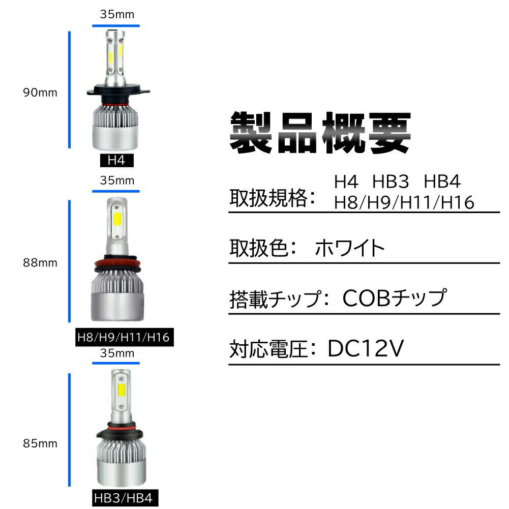 ■商品概要 ・純正バルブと交換するだけで簡単に取付!! ・コスパ抜群!! ・純正ハロゲンより圧倒的に明るい!! ・全国一律送料無料となります!! ■商品仕様 【個数】:2個入 【電圧】:DC12V 【取扱規格】:H4、H8/9/11/16、HB3、HB4 【取扱色】:ホワイト 【LEDチップ】:COBchip 【ルーメン値】:8000LM / (個) 【サイズ】:形状によって異なるため、画像をご確認ください 【適合車種】:DC12V車全般 【注意事項・全商品共通】 ■商品到着日から1ヵ月間の商品保証となります。 ■出荷は平日でのご対応で、普通郵便の場合は土日祝は配達がございません。 ■納品・領収証等は同封しておりません。注文履歴より発行、または出荷メールを納品書としてご使用下さい。 ■出荷後の住所不備による再送等、お客様ご都合でのご対応は送料が発生いたしますのでご注意下さい。 ■パッケージがないものは、保護材での簡易梱包となります。 ■商品によっては入荷時期により若干の仕様変更がある場合がございます。 ■輸入品のため、ご使用に支障がない程度の汚れや小傷がある場合がございます。 ■日本語取扱説明書は付属しておりません。商品について使用方法は商品説明をご参照下さい。 ■モニターの発色具合により、実物の色味と若干異なる場合がございます。 ■いかなる場合も、ご使用上での直接・間接の損害等については当方は一切責任を負いかねます。 ■その他事項等は決済方法・配送方法・返品規定等をご確認ください。 【注意事項・電球類】 ■ご購入前に必ず、取付箇所と商品のサイズや極性をご確認下さい。 ■商品の明るさや見え方は車種やレンズ形状、反射板等によっても異なります。 ■LED化の際は、予め十分な知識を備えあわせて施工、またご使用下さい。 ■車種によりLED化に伴い警告灯点灯やハイフラ等の様々な影響の可能性がございます。 ■社外品のため、加工や抵抗が必要な場合もあり全ての車種での正常な作動は保証できかねます。 ■お取付、ご使用については自己責任にて行ってください。 ■商品取付時・取付後の直接・間接の損害や工賃等については、当方は一切責任を負いかねます。LED ヘッドライト ヘッドランプ バルブ フォグランプ 車 爆光 H4 H8 H9 H11 H16 HB3 HB4 16000lm ポン付 交換用 汎用 後付け 12v ホワイト コスパ抜群!!!抜群の明るさ!! 1