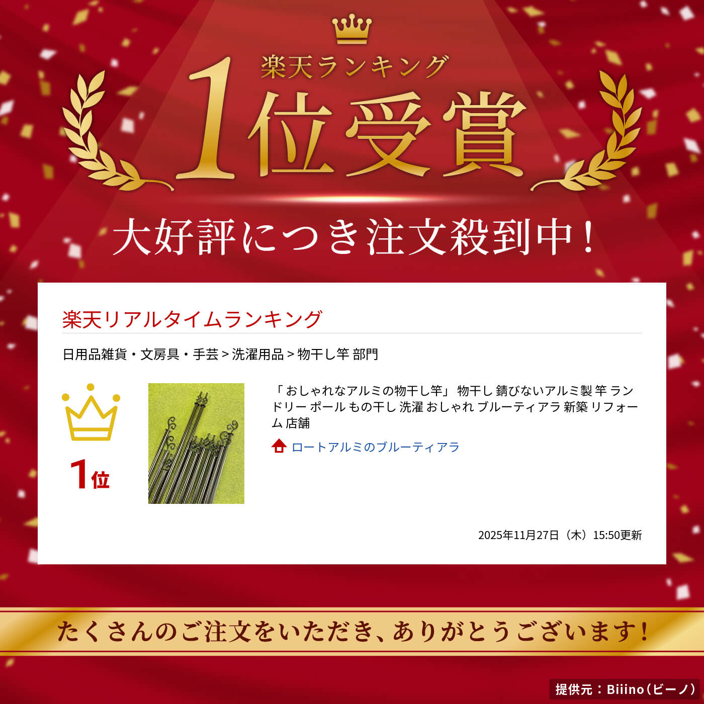 こちらは大型商品になりますので、送料無料ラインの対象外になります。 送料無料の表示がございますが、送料は別途です。 ご注文後、送料のお知らせを致します。 送料ご確認後のキャンセルは可能です。 送料分を明確にするために、送料を別途にいたしました。 お住まいの地域に寄りまして、ご注文後送料をお知らせいたします。 長物の送料は思いのほか高くなります。 埼玉県への送料約¥3,300円(個人様へのお届けはプラス¥4,400円加算されます) 愛知県への送料約¥4,400円(個人様へのお届けはプラス¥4,400円加算されます) 長崎県への送料約¥7,700円(個人様へのお届けはプラス¥4,400円加算されます) 西濃運輸の料金表により計算致します。 ※法人など会社や商店への送料の場合は、プラス¥4,400円は加算されません ※プラス¥4,400円の加算は、個人様宅へのお届けの場合、加算対象になります。 ※プラス¥4,400円は西濃運輸からの配送加算運賃になります。 ※※個人様宅への配送で、プラス¥4,400円が掛からない場合がございます。 ・お届け先のお近くの西濃運輸営業所止めにする場合、お客様が引き取りをお願いします。 ・お知り合いなどの、法人や会社宛てに変更する場合。 (ご注意点:建設現場へのお届けは、個人様宅扱いになりますので、追加送料が可算されます) 合計金額例(1本の場合) 個人様宅へのお届けの場合 定尺長さ2280mm 販売価格¥19,500円 埼玉県への配送 通常送料¥3,300円 プラス¥4,400円 合計金額¥27,200円(税込・送料込) 合計金額例(1本の場合) 法人や会社などへのお届けの場合(西濃運輸営業所止めの場合) 定尺長さ2280mm 販売価格¥19,500円 埼玉県への配送 通常送料¥3,300円 合計金額¥22,800円(税込・送料込) お届け地域によりまして、送料のお返事を致します。 お返事のお見積り内容により、キャンセルは出来ますのでご安心ください。 ※※※弊社埼玉県への直接のお引取りの場合は、送料+プラス送料は掛かりません。 定尺長さ2280mm 販売価格¥19,500円のみになります。 ご不安・ご不明なところが数多くあると思います。 どうぞ、お問合せをお待ちしています。 例えば・・・ 取付けできるのかな? 似合うのかな? 他と比べてどこがいいのかな? 製品図が欲しいな? ほんとうに錆びないのかな? どのくらいで届くのかな? 重いのかな? どんなことでもお答えさせて頂きます。 高額商品ですので、ご不安などをお聞かせください。この物干し竿なら外観を損なう事なく、 お住いの雰囲気を崩しませんから、おすすめです。 (現在は竿中央の飾りはありませんが、在庫はございます、プラス¥5,000円で取付け致します) アルミ製の物干し竿です。太さは30Φmmあります。 飾り部は140mmになります。 錆びない、軽い、伸縮式ではありません、1本物の竿 竿の耐荷重は約15キロになります。 長さにより、たわみが生じる場合がございますが、性能上問題はありません。 オーダーサイズも製作しますので、長さをご指定ください、お好みの長さで製作もしています。 最大長さ3000mmまで1本物で製作します。 こちらでは、定尺サイズ2280mmあります。 (飾りは140mmあります、竿自体は2000mmです) 1820mmスパンにぴったりです。 2階のバルコニーの窓にも 1階の掃き出し窓にも、お使いいただけます。 コンセプトは洗濯をお洒落に 干していない時もお洒落にです。 これで洗濯が楽しくなればとても嬉しいです(*^-^*) 両端の飾りは2種類ございます お好みのデザインをお選びください。 ●カールデザイン(重さとっても軽い1.2キロ) 全長2280mm(オーダーサイズ造ります) 工場焼付塗装・黒色艶消し仕上げ 補修用塗料(刷毛付)付属 ●バスケットデザイン(重さとっても軽い1.2キロ) 全長2280mm(オーダーサイズ造ります) 工場焼付塗装・黒色艶消し仕上げ 補修用塗料(刷毛付)付属 ●別売り品「ストレート型ブラケット」はこちら ●別売り品「アカンサス型型ブラケット」はこちら ●別売り品「吊り下げ型ブラケット」はこちら オーダー長さのご連絡方法をご説明致します。 通常オーダー長さは竿の部分3000mmまで長さ指定が出来ます。 (こちら以上の長さは特別オーダーでは4000mmまでは可能です) 2種の先端飾りの長さは140mmになります。 バスケットデザイン高さは、60mm カールデザインの高さは、110mmです。 最大長さで3280mmまで可能です。 飾り長さ140+竿長さ3000+飾り長さ140=全長3280mm (特別オーダーの場合4280mmが最大長さです) 両端の飾りは、固定式ですので、取り外しは出来ません。 リング形式のブラケットに設置の場合は設置出来ませんので、ご注意ください。 (こちらもオーダーで飾りを脱着式にすることが可能です、その場合別途に3,300円の費用が掛かります) 上記の脱着式をご希望の場合は、備考欄にご希望をご記入ください、ご注文後金額を加算致します。 オーダー長さの場合、竿の長さ+飾りの長さでご指定ください。 例:140(飾り)+2600(竿の長さ)+140(飾り)=2880mm(全長) ※通常ブラケットから100mm長くするのが、バランスが良いです。 お問合せフォームから、オーダーサ
