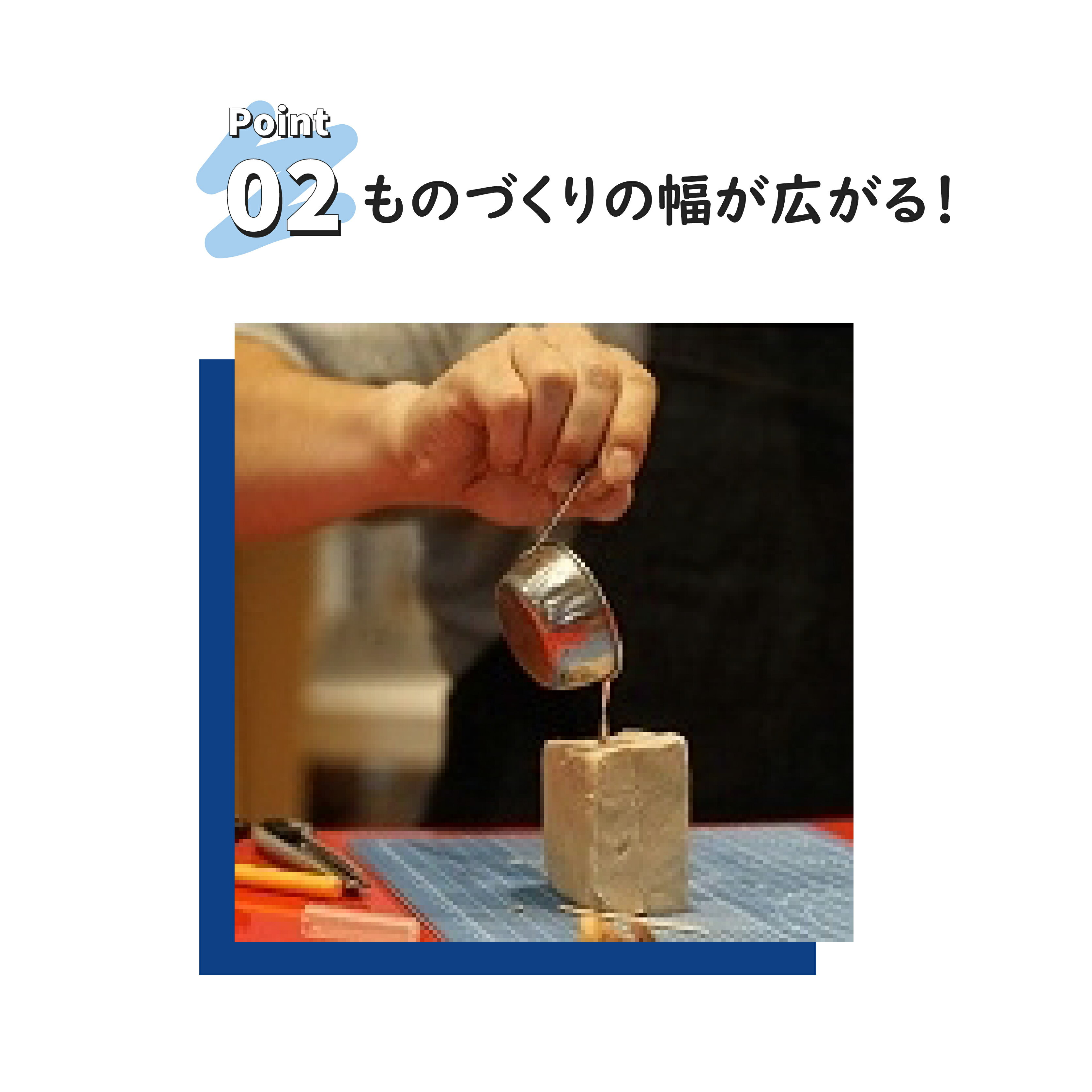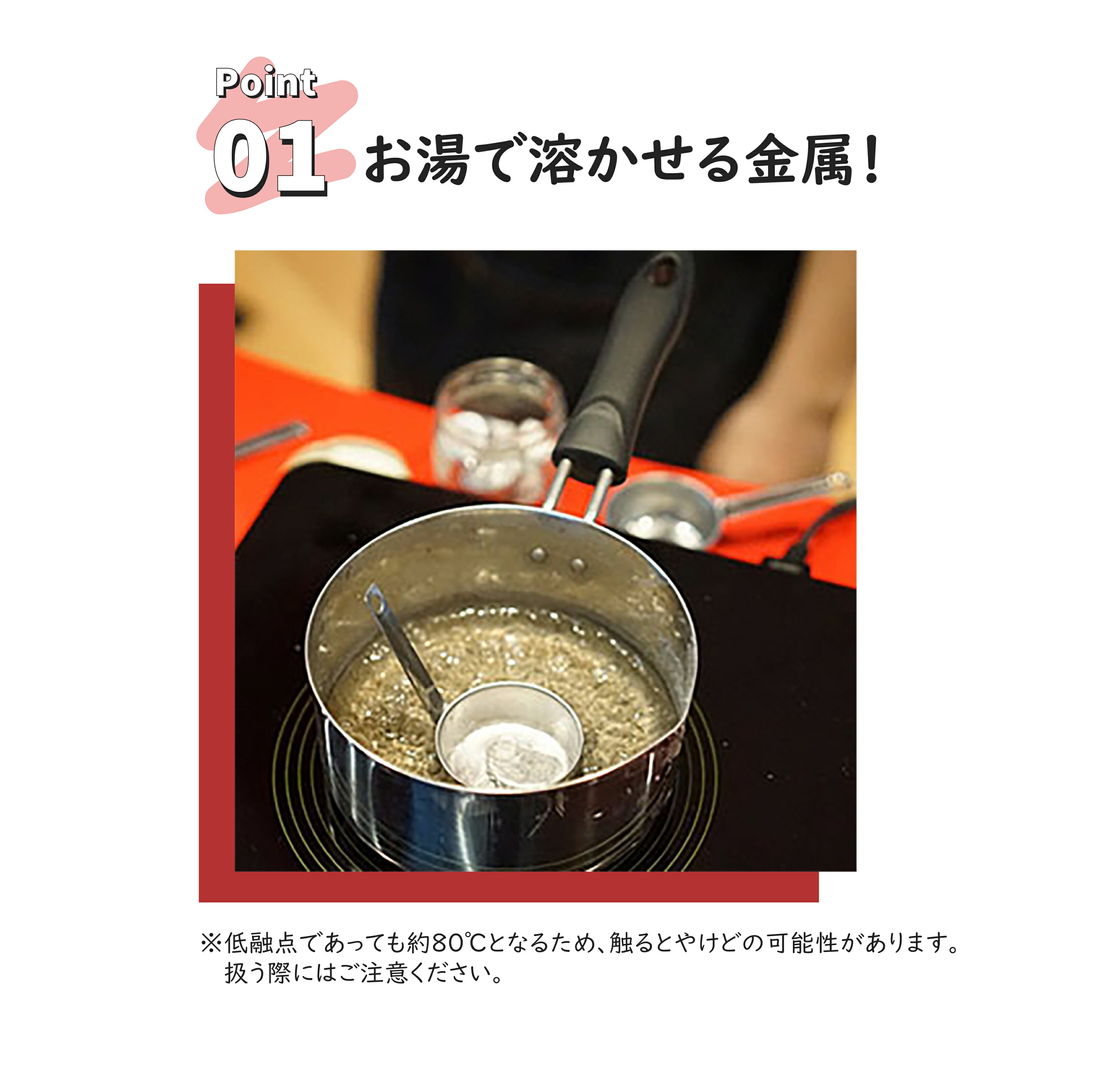商品情報サイズ梱包サイズ:14cm×11cm×5cm内容物(内容量)/材質●合金材30g(錫,ビスマス, インジウム)●粘土40g(炭酸カルシウム,潤滑油,植物性油脂)●ひしゃく1個(ステンレス)●説明書1枚商品説明※本品は鉛、カドミウムを使用しておりません。【注意】●食べられませんので絶対に口に入れたり触れさせないでください。●目鼻や口等に材料が付着した際は水で洗い流し、異常が出た場合には使用を中断し医師にご相談下さい。●合金材を使用して口に触れる可能性のある物を作成しないでください。●お子様がご利用になる場合は必ず保護者の方がご一緒に作業を行ってください。●火傷や怪我には十分ご注意ください。【生産国】日本おうちで鋳造 鋳造 キット 錫 工作 実験 夏休み 自由研究 小学生 子供 セット 簡単 科学 ハンドメイド プレゼント ギフト 誕生日 知育 おうち時間 【INSTANT CASTING KIT 低融点80℃-お湯で溶ける金属で自由工作できるキット-】 大人だけでなく、子供にも「より身近に」「より安全に」「より簡単に」楽しんでもらえる鋳造キット!数百度から数千度の高温で金属を溶かし、型に流し込みカタチを作る「鋳造」。INSTANT CASTING KITはその「鋳造」がおうちでできるキットです。低い温度で溶ける金属(融点約80℃)なので、ご家庭のお鍋で湯煎するだけで簡単に金属作品を作ることができます。ハンドメイド作品やオリジナルのパーツ、夏休みの工作など、おうち時間の楽しみとして利用していただけます! 5
