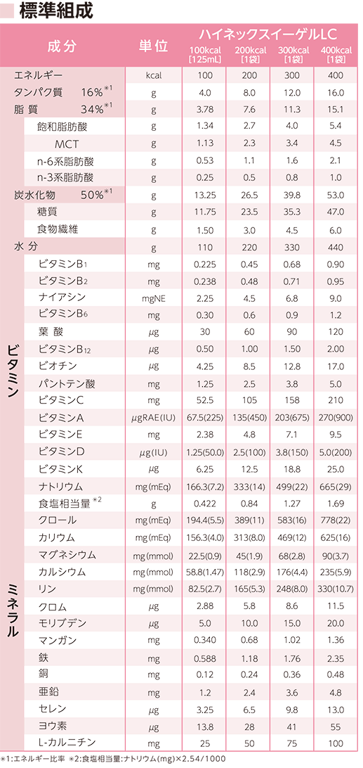 ※在庫数以上のご注文もお取り寄せ可能です。入荷後まとめての発送となります。 ※お取り寄せの場合は入荷後の発送となりますのでお届けまで日数をいただきます。 ※4〜7営業日で入荷予定です。ハイネックスイーゲルLCの特長 ・エネルギー比率50%の糖質量 ・食物繊維ペクチンを含有したpH依存粘度可変型栄養剤(※) ・大豆ペプチド、コラーゲンペプチドを使用した消化態タイプ ・L-カルニチンを25mg/100kcal配合 ・0.8kcal/mL、浸透圧360mOsm/L ・200kcalバッグをラインナップ (※)胃酸の分泌量や酸度の違いによって、ゲル状に変化しない場合があります。 ペクチンを含有する濃厚流動食品「ハイネックスイーゲルLC」 食物繊維としてペクチンを使用した液体の濃厚流動食品です。 pHの低下により液体からゲル状に流動性が変化します。 水分補給に配慮し、100kcal当たり摂取できる水分量を110mLに調整しています。 ペクチンの役割 1 . 食物繊維として ペクチン(Pectin:分子量 50,000~360,000)は、植物の葉、茎、果実に含まれる複合多糖類です。 消化管内では腸内細菌で分解されますが、消化酵素では分解されないことから食物繊維として機能します。 2 . 流動食のゲル化 ペクチンはカルシウムイオンとの反応により、架橋構造に変化し、流動食をゲル化します。 ハイネックスイーゲルに使用したリン酸カルシウムは、バッグ内ではイオン化せず、 カルシウムはリン酸カルシウムとして存在します。 pHが酸性(注)に傾くとカルシウムがイオン化し、ペクチンとの反応により、 ハイネックスイーゲルは液体からゲル状に変化します。 (注)胃酸の分泌量や酸度の違いによって、ゲル状に変化しない場合があります。 組成の特徴 1日当たり1,200kcal~1,600kcalを標準的な摂取量とする方にお使いいただける濃厚流動食品です。 ■炭水化物(糖質+食物繊維)13.3g/100kcal 糖質 マルトデキストリン 11.8g/100kcal 食物繊維 ペクチン 0.75g/100kcal その他繊維 0.75/100kcal ■脂質 3.8g/100kcal 吸収効率に配慮した脂肪酸組織 n-6系脂肪酸:n-3系脂肪酸=2:1 MCT(中鎖脂肪酸トリグリセライド)を全脂肪の約34% 脂肪酸の供給源 米油(n-6系脂肪酸)、エゴマ油(n-3系脂肪酸) ■タンパク質 4.0g/100kcal 消化吸収に配慮し、低分子ペプチド(コラーゲンペプチド、大豆ペプチド)とアミノ酸を使用した消化態タイプです。 乳タンパク質は使用していません。 内容量 【200kcal】 250mL×21袋/ケース【300kcal】 375mL×16袋/ケース【400kcal】 500mL×12袋/ケース 原材料名 マルトデキストリン(国内製造)、植物油、豚コラーゲンペプチド(ゼラチン)、中鎖脂肪酸トリグリセライド、大豆タンパク酵素分解物、酵母、カルニチン、コンブエキス/増粘剤(増粘多糖類)、リシン、ピロリン酸Na、塩化Mg、水酸化K、酸味料、ロイシン、リン酸Ca(大豆由来)、V.C、塩化K、トレオニン、イソロイシン、バリン、メチオニン、フェニルアラニン、結晶セルロース、ヒスチジン、トリプトファン、香料、V.E、ナイアシン、ピロリン酸鉄、パントテン酸Ca、V.B6、.B1、V.B2、V.A、葉酸、V.K2、V.D、 V.B12 賞味期限 製造日より9カ月(賞味期限は容器に記載) 保存方法 暗所に保存してください。常温で保存できますが、なるべく冷所に保存してください。凍結するような場所は避けてください。