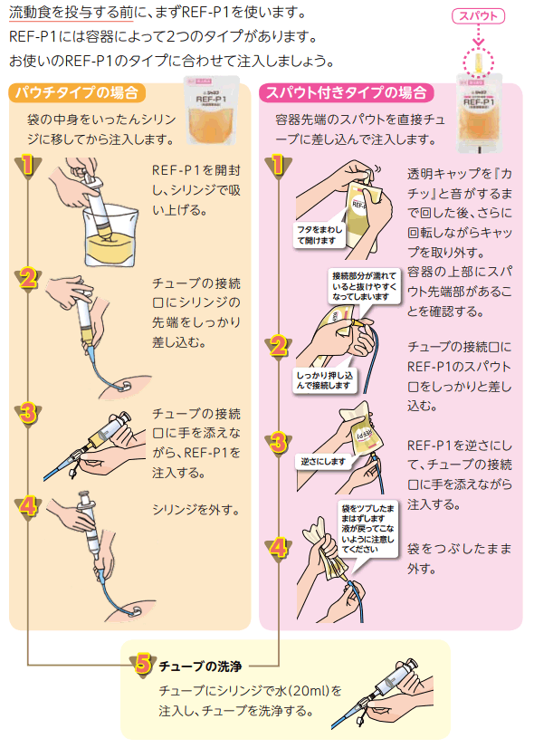 2ケースセットです。こちらは新規格対応タイプです。旧規格には対応していません。旧規格胃ろうチューブをご使用の方は『イエロースパウト』をご利用ください。REF-P1はスパウトの形状によって2種類ございます。 ご使用の接続部の形状が「新規格」の場合は「イージージョイント」を、「旧規格」の場合は「イエロースパウト」をご利用ください。※入り数にご注意ください。 REF-P1 イージージョイント(新規格対応) REF-P1 イエロースパウト(旧規格対応) REF-P1の特長 順調な流動食摂取をサポートする粘度調整食品 流動食のようなカルシウム配合量の多い液状食品を“とろり”とした粘度に調整できます。食物繊維、水分補給にも役立ちます。新規格対応タイプ。 ◎流動食のようなカルシウム配合量の多い液状食品を"とろり"とした粘度に調整。 多くの市販液体流動食への使用が可能です。 ◎食物繊維の補給ができます。 原料のペクチンは水溶性の食物繊維です。 1袋(90g)で1.4gの食物繊維を補給できます。 ◎水分補給に役立ちます。 1袋(90g)に約88mLの水分を含有しているため、水分補給の手間が軽減されます。 ◎「REF-P1イージージョイント」は新規格対応、「REF-P1イエロースパウト」は旧規格対応品となります。 【使用方法】 あらかじめ「REF-P1」1袋(90g)をご使用いただいた後に、流動食のようなカルシウム含有量の多い液状食品(300〜400mL)をご使用いただきますと流動食がとろりとなります。 REF-P1特有のメリット 1)細いチューブでも投与できます。 粘度が低いため細いチューブ(8Fr.以上)でも投与可能です。 経鼻胃管、PTEG、PEG、PEJなどあらゆるケースで使用できます。 なお、体温程度に加温することで、若干ではありますが流動性が増します。ただし、加温する際は加温し過ぎないようご注意ください。 2)胃だけでなく小腸への流動食投与時にも半固形化ができます 細いチューブによる投与が可能なので、投与チューブの先端が小腸留置でも流動食の半固形化ができます。 3)水分補給に役立ちます REF-P1は1袋(90g)に約88mlの水分を含有しています。そのため水分補給の手間が軽減されます。 4)食物繊維の補給ができます ペクチンは水溶性の食物繊維です。1袋当たり1.4gの食物繊維を補給できます。 5)流動食を選びません 医薬品経腸栄養剤を含め、多くの市販液体流動食と合わせて使用が可能なので、患者さんに適した流動食と併用できます。 REF-P1の注入 ※流動食の注入、チューブ洗浄などの詳しい手順は「液体流動食の半固形化ハンドブック」に掲載されています。ご希望の方には同封いたしますので注文ボタン上のセレクトボックスを「希望する」にしてご注文ください。 ご希望の方にハンドブックを同封します 液体流動食の半固形化ハンドブックをご希望の方に同封します。注文ボタン上のセレクトボックスを「希望する」にしてご注文ください。 第1章 流動食の半固形化 第2章 半固形化の実践 第3章 水分補給について 第4章 よくある質問 栄養成分:1袋(90g)当たり エネルギー 5kcal たんぱく質0.0g脂質0.0g炭水化物1.9g-糖質0.5g-食物繊維1.4g食塩相当量0.3g水分87.7g 内容量 (90g×9袋×3箱)×2ケース(9袋入りの中箱が計6箱) 原材料名 ゲル化剤(ペクチン)、pH調整剤 保存方法 直射日光を避け、常温で保存してください。 賞味期限 製造日より300日※商品の賞味期限は商品名に記載されたものとなります。 使用上の注意 ・静脈内へは絶対に注入しないでください。 ・容器のまま電子レンジにかけないでください。 ・開栓後はお早めにご使用ください。 ・保存中にペクチン由来のオリ(沈殿物)が生じることがありますが、品質に問題はありませんので、よく振ってご使用ください。 ・医師、栄養士等の指導に従って使用してください。 ・体温程度に加温するときは、開栓せず容器のままお湯に入れてください。 ・水分補給や流動食の希釈は流動食中のカルシウム濃度を下げ、「REF-P1」を使用しても、とろりとならなくなるので同時に行わないでください。