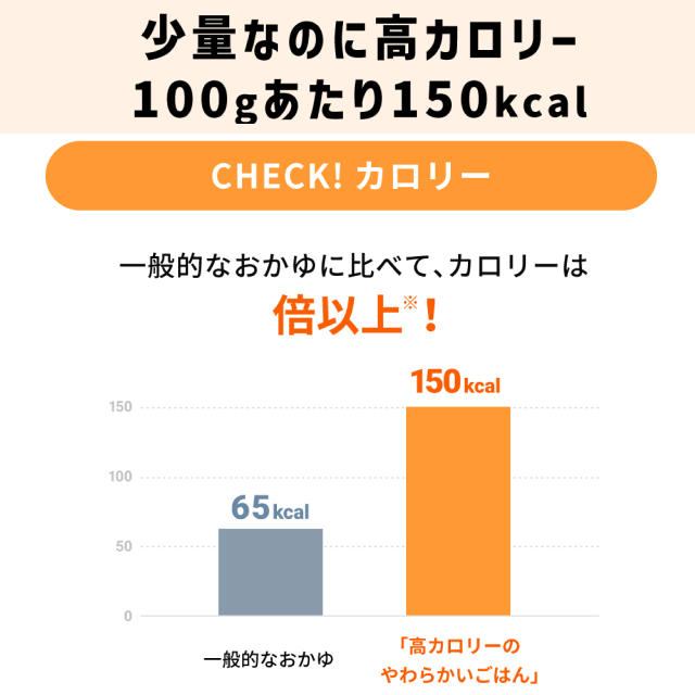 ※お取り寄せ品は入荷後の発送となりますのでお届けまで日数をいただきます。 ※4~5営業日で入荷予定です。 【価格改定・原材料変更のお知らせ】 11月より価格改定(顕著な原材料価格高騰などのため)。 また、11月下旬頃より、原材料が変更となります。 そのため、「白がゆ・玉子がゆ」は成分も変更となります。 たんぱく質7.0g→5.5g、脂質5.2g→5.5g、炭水化物18.8g→19.5g 1カップあたり カロリー 150kcal たんぱく質 7.0g(白がゆ・玉子がゆ) たんぱく質 5.5g(昆布だし・おかか・ひじきの混ぜごはん風) ■「高カロリーのやわらかいごはん」ラインナップ [白がゆ]ふっくらと炊き上げたお米のおいしさが引き立つ、やさしい味わい [玉子がゆ]ふんわり玉子と鶏だしの旨味がきいた、コクのあるまろやかな味わい [昆布だし]昆布のまろやかでさっぱりとした旨味を引き立てた、風味豊かなやさしい味わい [おかか]鰹節の香ばしい香りと深い旨味が楽しめる豊かな味わい [ひじきの混ぜごはん風]ひじきとお米の食感がふんわりと調和し、満足感が得られる新しい味わい1カップあたり カロリー 150kcal たんぱく質 7.0g(白がゆ・玉子がゆ) たんぱく質 5.5g(昆布だし・おかか・ひじきの混ぜごはん風) ■「高カロリーのやわらかいごはん」ラインナップ [白がゆ]ふっくらと炊き上げたお米のおいしさが引き立つ、やさしい味わい [玉子がゆ]ふんわり玉子と鶏だしの旨味がきいた、コクのあるまろやかな味わい [昆布だし]昆布のまろやかでさっぱりとした旨味を引き立てた、風味豊かなやさしい味わい [おかか]鰹節の香ばしい香りと深い旨味が楽しめる豊かな味わい [ひじきの混ぜごはん風]ひじきとお米の食感がふんわりと調和し、満足感が得られる新しい味わい ■食べきりサイズにカロリーをたっぷり詰め込みました。 健康に生きるために必要なカロリーを、毎日の食事から。 100gとコンパクトな食べきりサイズで、150kcalとたっぷり高カロリー。 ■毎日食べてほしいから、味にこだわりました。 国産の精米を使用。 やわらかいながらも水っぽくなく、お米のおいしさを活かし、毎日食べたくなる味を目指しました。 ■舌でつぶせるよう、やわらかく炊き上げました。 食べやすさを重視し、やわらかさにこだわったユニバーサルデザインフード規格製品です。 【主な原材料】 [白がゆ] 精米(国産)、コラーゲンペプチド(豚肉・ゼラチンを含む)、中鎖脂肪酸油、米粉、還元デキストリン/乳化剤 [玉子がゆ] 精米(国産)、コラーゲンペプチド(豚肉・ゼラチンを含む)、中鎖脂肪酸油、いりたまご(小麦・卵・大豆を含む)、米粉、還元デキストリン、チキンエキス調味料(鶏肉を含む)/調味料(アミノ酸等)、トレハロース、乳化剤、増粘多糖類、カロチノイド色素 [昆布だし] 精米(国産)、なたね油、コラーゲンペプチド、昆布だし、米粉、還元デキストリン、昆布エキスパウダー、食塩/乳化剤、調味料(アミノ酸) [おかか] 精米(国産)、なたね油、コラーゲンペプチド、米粉、還元デキストリン、風味調味料(かつお)、かつお節粉末、食塩、魚類混合粉末/調味料(アミノ酸等)、乳化剤、酸味料 [ひじきの混ぜごはん風] 精米(国産)、なたね油、コラーゲンペプチド、下茹でにんじん、つゆ、米粉、還元デキストリン、乾燥ひじき、食塩/調味料(アミノ酸等)、乳化剤 【使用上の注意】 原材料に含まれるアレルゲン (28品目中): 白がゆ、昆布だし:豚肉、ゼラチン 玉子がゆ:小麦、卵、大豆、鶏肉、豚肉、ゼラチン おかか:豚肉、ゼラチン、さば ひじきの混ぜごはん風:豚肉、ゼラチン、小麦、大豆 ● 室温で保管ください。 ● 開封後はすみやかにご使用ください。 ● プラスチックカップ入りです。 カップに漏れや膨張のあるものは使用しないでください。 ● 開封時に異様な変色、 異臭や凝固のあるものは使用しないでください。 ● 常温、もしくは湯煎 電子レンジで加熱してお召し上がりいただけます。 電子レンジで加熱する時は、ふたを少し開けてください。 電子レンジ加熱時間の目安 (500W / 600W) 約 10秒~20秒 ※加熱時間の目安は、電子レンジの機種、 ワット数等により異なる場合がありますので加減してください。 ・オート加熱不可 ・湯煎の場合、袋に製品を入れて温めてください。 ● 湯煎 電子レンジで加熱後は、容器や中身が熱くなりますのでご注意ください。 ● 食事介助が必要な方に使用される場合は、 介助者が嚥下の様子を見守ってください。 ● 医師・栄養士等の指導にもとづいて使用されることをお勧めします。 ● 低温で保存すると、食感が変化(硬化)したり、風味が劣化したり、 離水 (米等に含まれる水分が分離)することがあります。 そのような場合は、 少し温めてから、かき混ぜてお召し上がりください。