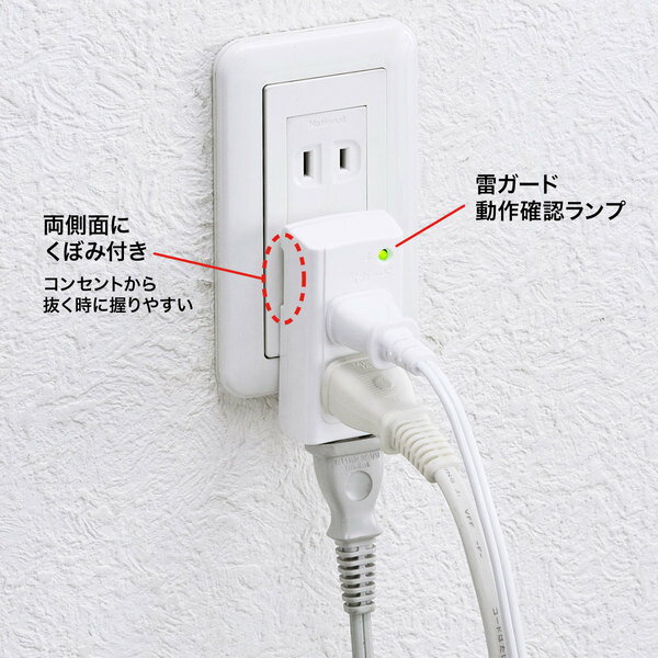 【商品説明】●雷サージから機器を守ります。内蔵されたサージ低減素子(バリスタ)が、雷サージを低減し機器を守ります。●雷ガードが作動しているかどうかランプで確認ができます。※ランプが消えた場合は効果がなくなっていますので新しいものに交換してください。●雷サージ低減素子(バリスタ)の寿命がきた時に、発熱を防ぐ設計となっており安全です。●プラグはトラッキング火災に極めて有効な絶縁キャップ付きです。【雷ガードについて】雷が落ちるとき、高電圧が送電線を伝わり各家庭のブレーカーが働く前に電気器具に到達し、その器具の基板が壊れることがあります。その基板を守る為のプロテクターです。原理は、内蔵したバリスター素子の働きにより、一定以上の電圧が発生した時、その異常電圧を吸収し家電製品、パソコンなどへは、制限された低い電圧(制限電圧)のみを流します。【仕様】■定格容量:15A・125V(1500Wまで)■プラグ:2P(トラッキング火災予防絶縁キャップ付き)■差し込み口:2P・3個口■サイズ:W35×D22.5×H70mm■重量:70g■バリスタ電圧:470V■制限電圧:775V■最大サージ電圧:2500V ※基盤実装のヒューズ性能により2500Vとなります。■サージ耐量:1800A■材質:ユリア樹脂■使用地域:日本国内のみ。日本以外ではご使用いただけません。※本製品は屋内専用です。■適合規格:電気用品安全法(PSE)技術基準適合品■欲しいタップが簡単に探せる電源タップ検索はこちら電源タップ機能別対応表(2Pタップ)はこちら【発送予定について】表記の発送予定はあくまで目安です。メーカーの在庫状況によっては、さらにお時間をいただく場合がございます。