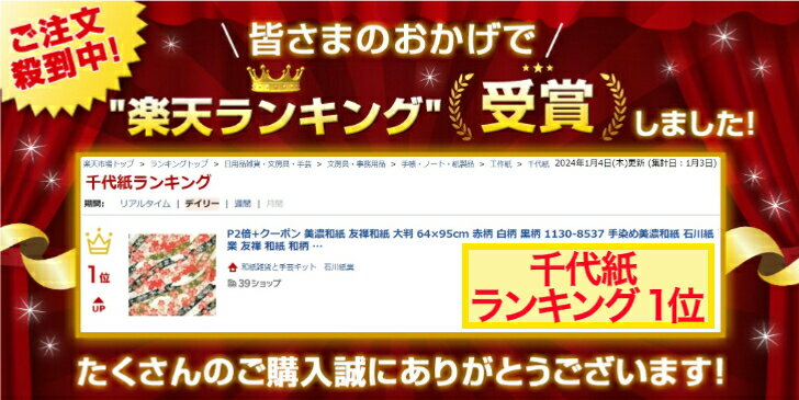 商品情報商品説明1300年歴史を誇る美濃和紙を、京都の染元で一色ごとに手染めした、こだわりの友禅柄和紙。【配送】個箱包装(紙は丸めて梱包)「運送業者保険対応」不良到着の場合、良品を再送。【用途】和紙雑貨の手芸材料・素材 に、最適です!1枚のサイズ 約縦640×横950mm紙を切る「はさみ」で、簡単に切れます。紙を貼る「のり」で、簡単に貼れます。木、ボール紙など、異素材は「木工用ボンド」がおすすめ。「裏面は白」で、鉛筆で下書きできます。「60×60cm角」の大きな折り紙が1枚できます。「30×30cm角」カットで6枚できます。「20×20cm角」カットで12枚できます。サイズたて 約640 × よこ 約950mm素材/材質美濃和紙納品形態安心の個箱発送(紙は丸めて梱包)生産国日本 Made in Japanブランド美濃和紙ブランド石川紙業「和紙屋の手しごと」ブランド品番1130-8537 バーコード4532245011306柄ごとにバーコードなし)ご連絡※手仕事のため、商品一つ一つに、できあがりに差異があります。また、サイズや色、柄が若干異なる場合がございます。※画像は、モニターのご環境によって、実物と異なって見える場合もございますので、あらかじめご了承下さい。ご注意※和紙の性質上、摩擦・水ぬれにご注意下さい。汚れは乾いた布でお拭きください。※お取り置きは、原則として1週間以内です。それ以上の保管が必要な場合は、お問い合わせください。※配送は元払い、当社の配送方法のみで、変更はできません。※商品は、同時に店頭販売しています。確認しておりますが、時間差で在庫がなくなることもございます。あらかじめご了承を願います。配送方法佐川急便で発送いたします。運送業者保険対応。不良到着の場合、良品を再送。支払方法クレジットカード決済・銀行振込・代引・Apple Pay・コンビニ前払い後払い和紙屋の手しごと和紙屋の手しごと 郷土の人々とともに ひとつひとつ手作り。明治35年創業1902年、石川紙業は、美濃和紙の産地、岐阜県美濃市で、心あたたまるものを企画し、地域の人々とともに、手作りしている、石川紙業のブランドです。美濃和紙ブランド特許庁商標登録された美濃和紙ブランドは、美濃和紙ブランド協同組合が審査認定した美濃和紙製品に付与。美濃和紙ブランド、美濃機械すき和紙ブランド登録商品。伝統工芸品1300年歴史を誇る、日本最古の歴史を持つ美濃和紙。日本の伝統工芸品に認定。原料の仕込みから漉き、圧搾、乾燥まで、複雑な工程を経て完成する美濃和紙。本美濃紙の伝統的技法は国の重要無形文化財で、2014年11月にユネスコの無形文化遺産に登録。日本製。日本/海外土産美濃和紙の産地で、作られた美濃和紙を、友禅柄染めの本場、京都にて手染め。日本、岐阜県、美濃市のお土産におすすめです。また、日本を代表する美濃和紙友禅染紙で、使用用途が広く、かさばらず、軽く運びやすく、話題性があり、海外のお土産にもおすすめです。ノベルティ美しい素材としてお使いも頂け、加工も可能です。オリジナルデザインも出来ます。折り紙、雑貨、加工製品は、ノベルティ、記念品におすすめです。プレゼントディスプレイ、手芸、プレゼントパッケージ、使用用途が広く、ものづくり素材としてお使いいただけます。誕生日プレゼント、母の日、父の日、敬老にどうぞ。丈夫な為、海外へ出張する男性へのプレゼントもおすすめ。商品の特徴石川紙業の美濃和紙友禅染紙は、他の友禅和紙より、発色がよく、細かな柄が特徴です。しなやかで破れにくい美濃和紙を使用しているため、版を重ねられ、美濃和紙友禅染紙の製作が実現できています。ものづくり素材として優れています。色ごとに型が必要で、専門の職人が製作。一色ごとに、専門の職人が染料の配合。一色ごとに手刷りを重ねて製作。使用シーンディスプレイ、手芸、折り紙、パッケージ、壁紙、敷き紙、ものづくり素材と、使用用途が広く、使用できます。美濃和紙 友禅和紙 大判 64×95cm 赤柄 白柄 黒柄 1130-8537 手染め美濃和紙 石川紙業 友禅 和紙 和柄 和風 和模様 千代紙 折り紙 ちぎり絵 包装紙 ラッピング 手芸 材料 用品 工作 生地 用紙 人形 教室 文化 教育 工作 民芸 短冊 花 黒 波 友禅和紙 大判 美濃和紙 赤柄 白柄 黒柄 京都で手染め ハンドメイド材料 6