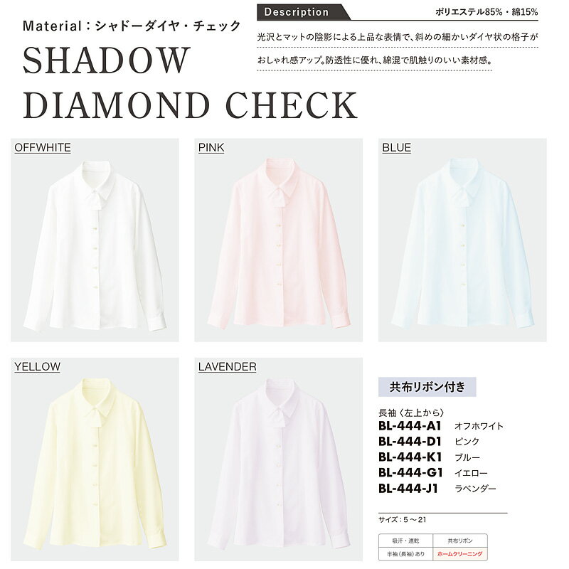 【素材】 シャドーダイヤ・チェック(ポリエステル85%・綿15%) 【カラー】 A1(オフホワイト)、D1(ピンク)、K1(ブルー)、G1(イエロー)、J1(ラベンダー) 【仕様】 ・防透 ・UVカット ・吸汗速乾 ・同型長半袖 ・共布リボン取り外し可能 ・ホームクリーニング可能 光沢とマットの陰影により細かいダイヤ状の格子を表現し、おしゃれ感UP。 ・GROW(グロウ) / SerVo(サーヴォ) ・事務服 / 上品 / 女性用 / レディス ・ユニフォーム / 制服 / 仕事 / 人気長袖ブラウス GBLL-1252 長袖ブラウス GBLL-1664 半袖ブラウス BL-445 サイズ 5号 7号 9号 11号 13号 15号 17号 19号 21号 バスト 93 96 99 102 105 110 114 118 122 肩幅 37 37.5 38.5 39.5 40 40.5 41 42 42.5 着丈 60 61.5 62.5 63.5 63.5 64 64 64 64 袖丈 54.5 55 55.5 56 56.5 56.5 56.5 56.5 56.5 【素材】 シャドーダイヤ・チェック(ポリエステル85%・綿15%) 【カラー】 A1(オフホワイト)、D1(ピンク)、K1(ブルー)、G1(イエロー)、J1(ラベンダー) 【仕様】 ・防透 ・UVカット ・吸汗速乾 ・同型長半袖 ・共布リボン取り外し可能 ・ホームクリーニング可能 光沢とマットの陰影により細かいダイヤ状の格子を表現し、おしゃれ感UP。 ・GROW(グロウ) / SerVo(サーヴォ) ・事務服 / 上品 / 女性用 / レディス ・ユニフォーム / 制服 / 仕事 / 人気 コーディネートや合わせ買いには同ブランドが断然オススメ!Check it out! GROW春夏 GROW秋冬 ジャケット ジャケット ベスト ベスト ブラウス半袖・七分袖 ブラウス長袖 スカート・キュロット スカート・キュロット パンツ パンツ ワンピース ワンピース オーバーブラウス カーディガン カットソー アクセサリー OUTLET(アウトレット)