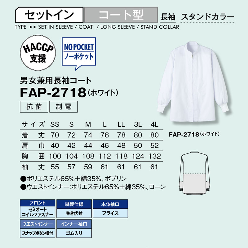 衛生衣 長袖 コート [男女兼用] [常温作業場向け] FAP-2718 HACCP 食品工場 食品白衣 工場作業 作業着 作業服 食品衛生白衣 飲食 コスパ ジャケット FOOD FACTORY フードファクトリー Servo サーヴォ