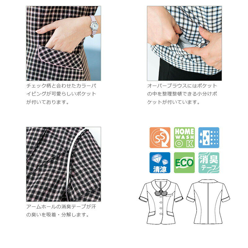 【素材】 SFドビーチェック(ポリエステル80%、キュプラ20%) 【カラー】 36(ホワイト×ブルー)、39(ブラック×ピンク) 【仕様】 ・ホームクリーニング ・吸汗・速乾素材 ・清涼素材・加工 ・エコ素材 ・消臭テープ ・左胸箱ポケット ・両脇挟み込みポケット(右側小分けポケット付き) ・リボン取り外し可能 ・袖ぐり消臭テープ付き ・一重仕立て コットンが原料のキュプラを複合させ、ソフトな着心地を実現した「サラフォート」が、衣服内の湿気を素早く吸収し放出し、暑い季節もさわやかに過ごせます。 ・BONMAX(ボンマックス) / BONOFFICE(ボンオフィス) ・事務服 / 上品 / 女性用 / レディス ・ユニフォーム / 制服 / 仕事 / 人気オーバーブラウス AJ0828 スカート AS2261 スカート AS2262 ※こちらの商品は在庫限りのアウトレット商品の為、返品・交換は不可となります。※初期不良の場合のみ、交換対応致しますが、交換商品が在庫切れの場合は返品対応となります。※ご注文頂いたにも関わらず、メーカーにて在庫切れとなりましたら、ご注文をキャンセルさせていただきますので、ご了承ください。 サイズ 5号 7号 9号 11号 13号 15号 17号 19号 21号 バスト 88 91 95 99 103 107 113 119 125 肩幅 37 38 39 40 41 42 43.5 45 46.5 着丈 52 53 54 55 56 57 57 58 58 袖丈 20 21 21 22 22 23 23 23 23 【素材】 SFドビーチェック(ポリエステル80%、キュプラ20%) 【カラー】 36(ホワイト×ブルー)、39(ブラック×ピンク) 【仕様】 ・ホームクリーニング ・吸汗・速乾素材 ・清涼素材・加工 ・エコ素材 ・消臭テープ ・左胸箱ポケット ・両脇挟み込みポケット(右側小分けポケット付き) ・リボン取り外し可能 ・袖ぐり消臭テープ付き ・一重仕立て コットンが原料のキュプラを複合させ、ソフトな着心地を実現した「サラフォート」が、衣服内の湿気を素早く吸収し放出し、暑い季節もさわやかに過ごせます。 ・BONMAX(ボンマックス) / BONOFFICE(ボンオフィス) ・事務服 / 上品 / 女性用 / レディス ・ユニフォーム / 制服 / 仕事 / 人気 コーディネートや合わせ買いには同ブランドが断然オススメ!Check it out! BONOFFICE春夏 BONOFFICE秋冬 ジャケット ジャケット ベスト ベスト ブラウス半袖・七分袖 ブラウス長袖 スカート・キュロット スカート・キュロット パンツ パンツ ワンピース ワンピース オーバーブラウス カーディガン カットソー アクセサリー