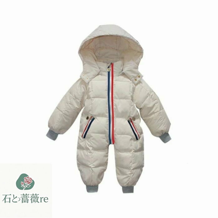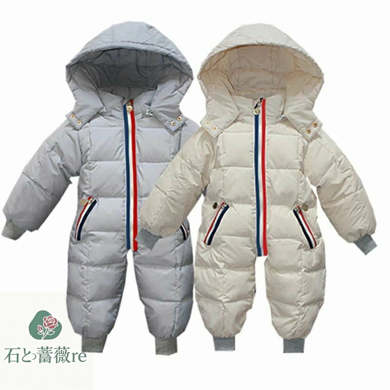 ジャンプスーツ 防寒カバーオール カバーオール ダウン 厚手 女の子 男の子 ユニセックス べビー キッズ 子供服 カジュアル かわいい あったかい 雪 フード フロントジッパー トリコロール グレー/ホワイト 73cm/