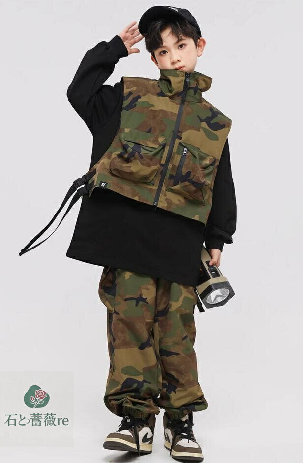 迷彩柄子供ヒップホップジャズダンスウェア 男の子女の子ロングtシャツ 長袖 迷彩柄ベスト パーカー 迷彩サルエルパンツ 春服秋服キッズダンス衣装 hiphop jazz チアガール 舞台演出服 イベント ステージ