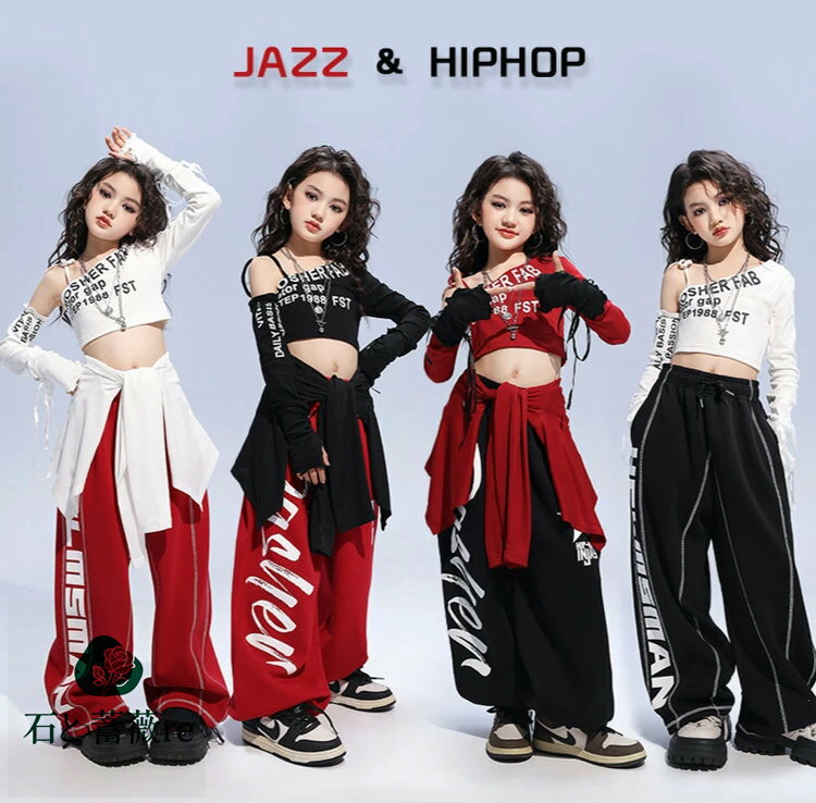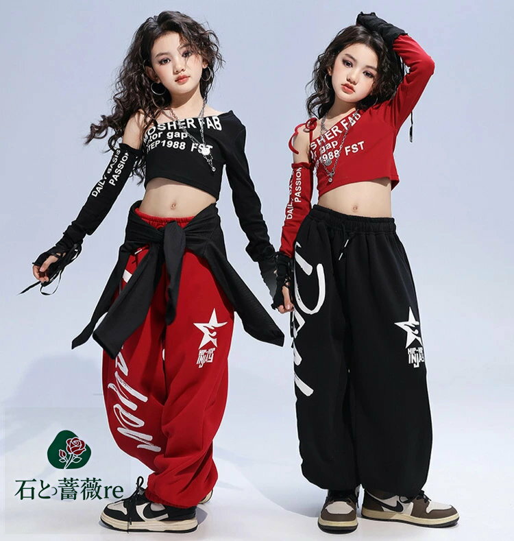 キッズ へそ出し トップス ダンス衣装 赤ズボン 黒パンツ チェック柄 セットアップ k-pop 衣装 韓国 ヒップホップ 長袖 ロングパンツ ダンス衣装 キッズ チアガール スカート レッド ブラック アイドル 衣装 演出服 発表会 原宿系 hiphop ダンスウェア Jazz ステージ衣装