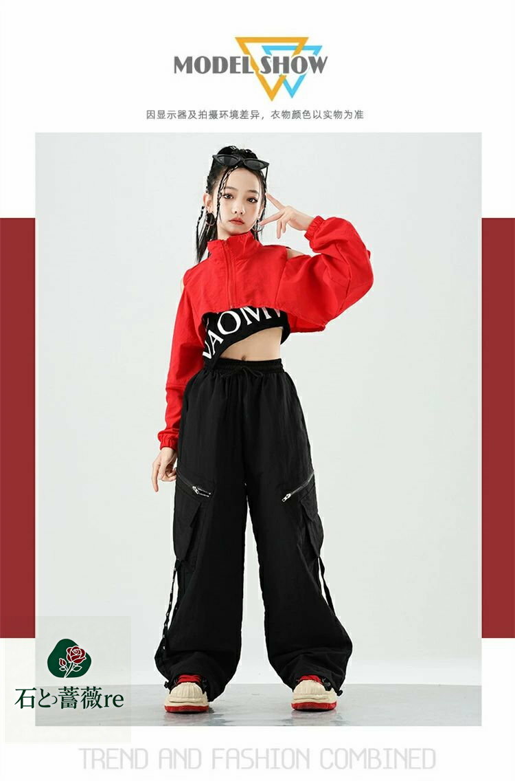 赤 黒 へそ出し キッズダンス衣装 セットアップ ジャケット k-pop 衣装 長袖 シャツ タンクトップ レッド ロングパンツ チアダンス 子供 女の子 ヒップホップ カッコイイ 練習着 かわいい 演出服 ジャズダンス 社交ダンス HIPHOP イベント 応援団 発表会 ステージ衣装