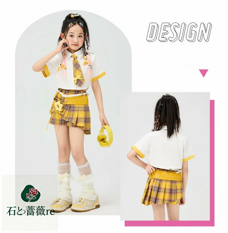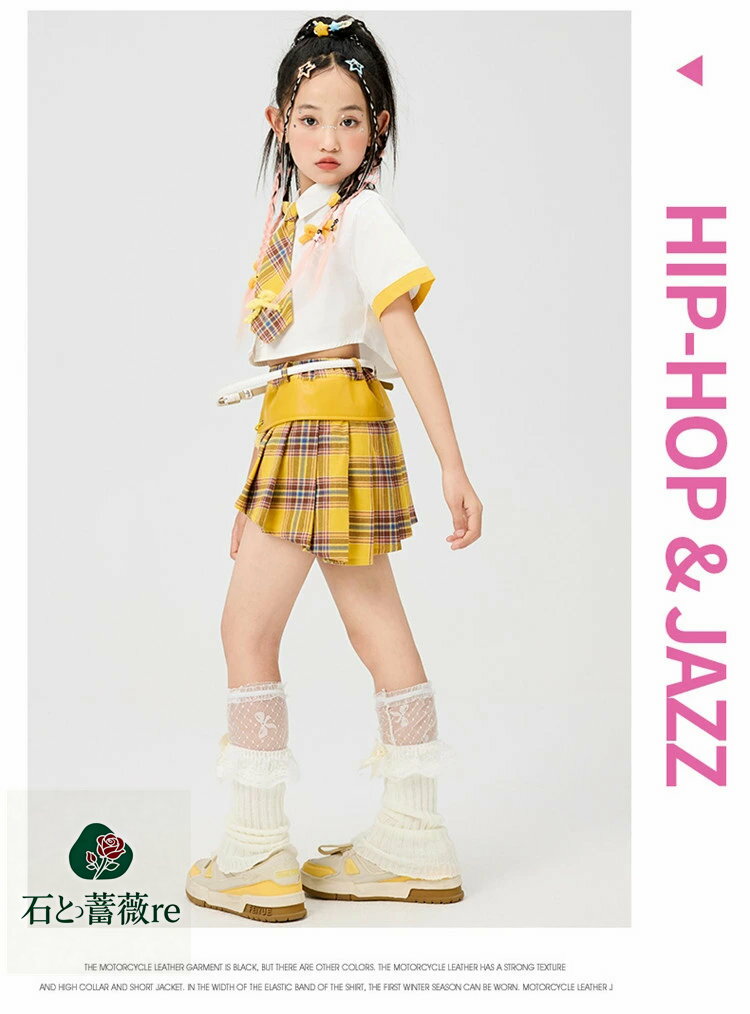 可愛い 応援団 hiphop 団体服 子供服 ダンス衣装 女の子 Y2K k-pop アイドル イエロー タータンチェック ネクタイ ホワイト へそ出し 半袖 シャツ スカート レッグウォーマー キッズ ジャズ 小学生 jazz 練習着 ジュニア おしゃれ 発表会 110-180