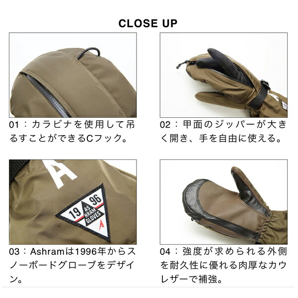 ASRM25W07 / ランバー センタージッパーが大きく開閉する3レイヤーミトン ジッパーが大きく開閉し、カメラやスマホなどをストレスなく使用できるLUMBER。 開閉部をセンタージッパーに変更し、全体のアウトラインから見直すアップデートを行っています。アウターシェルに耐久性・耐水性の高い3レイヤーの日本製ナイロンリップストップを使用。 また防水・透湿性に優れるインサートフィルム、DRI-VENTを搭載し雪と寒気をシャットアウト。手のひらの強度が求められる外側には耐久性の高いカウレザー(牛革)を使用し補強。 インナーグローブIFGシリーズと合わせて使用することで、このグローブの性能を最大限に引き出すことができます。 サイズ S/M/L カラー BEIGE FIELD ゲレンデ~バックカントリー 裏地 フリース FIT レギュラー 手のひら レザー インナーグローブとしてIFGシリーズの使用をおすすめします。Ashram Gloves(アシュラム) 何よりも優先するのはカッコいいこと 濡れない、あたたかい、ムレない、壊れない...スノーボードグローブに求められること。頑丈な素材を使い、縫い目を少なくし、パーツを減らしてシンプルにすれば、耐久性に自信ありの量産型スノーボードグローブが完成します。でもAshram Glovesは、そんな “顔のないグローブ” を作ることはしません。各モデルにコンセプトがあり、新しい素材を取り入れ、ディテールにこだわったスノーボードグローブを毎シーズンラインナップします。 このように自由にデザインが可能なのは、最高品質のGORE-TEXインサートフィルムを使用できる数少ない日本ブランドだからです。GORE-TEXインサートフィルムにより、「濡れない・あたたかい・ムレない」というグローブの基本性能を確保できるため、より自由な発想をいかしたデザインが可能になるのです。またアウター素材に日本製生地を使用することで耐久性が高くなり、グローブのトータルバランスも格段にアップします。 Ashram Gloves が何よりも優先するのはカッコいいこと。 なぜならスノーボードグローブとして濡れない、あたたかいは当たり前のことだから。“表情豊かなグローブ” を作れるのは、1996年からスノーボードグローブをデザインしてきたAshram Glovesだからこその“なせるワザ”なのです。