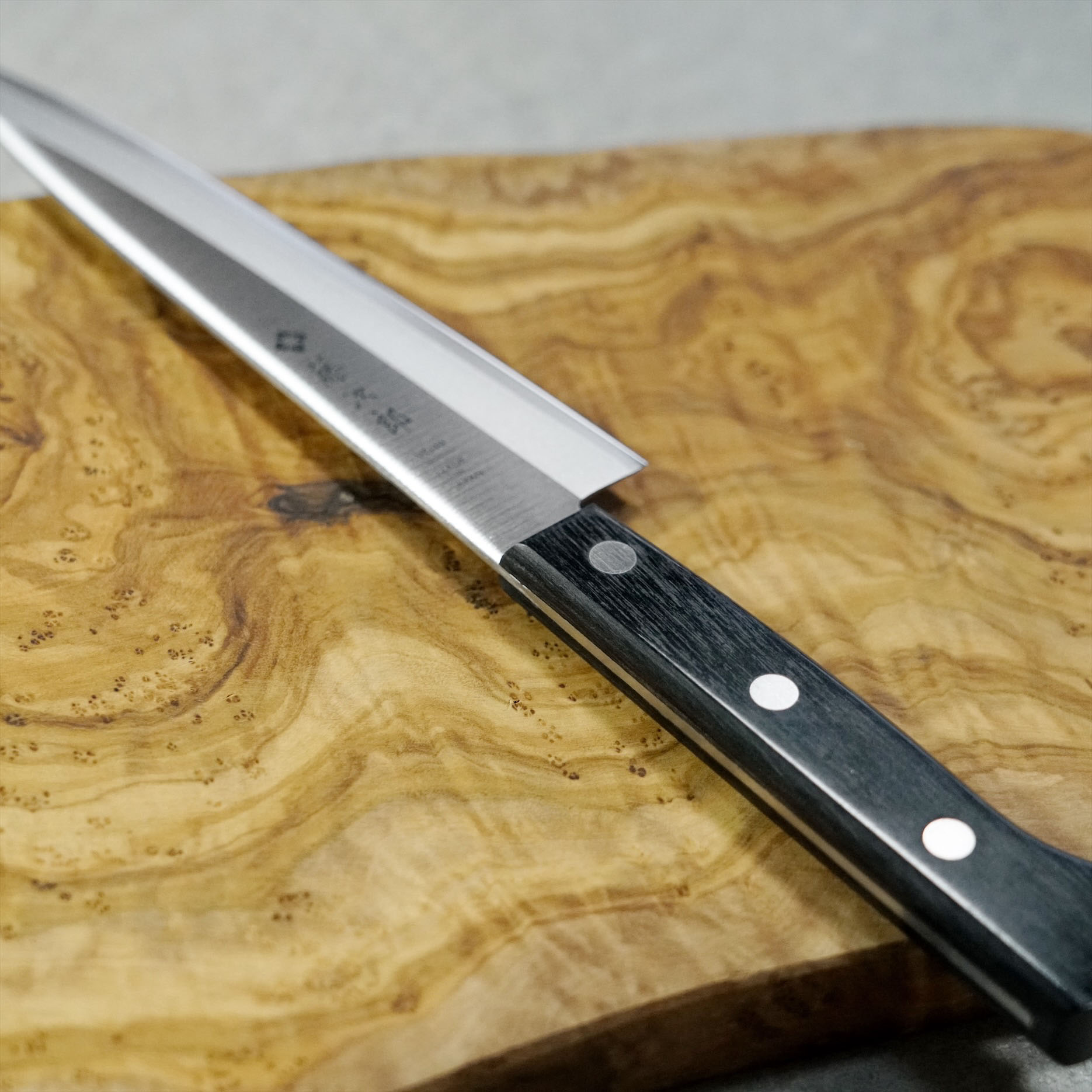 仕 様 刃のV金10号は鋼に匹敵する切れ味と持続性が評価され、プロが愛用しています。 その上、V金10号はステンレスなので錆を気にせずメンテナンスが楽です。 藤次郎 / 藤次郎作 ペティナイフ F-318 刃渡り:約135mm 全長:約245mm 刃幅:約30mm 刃厚:約1.8mm 重量:約65g 心材:V金10号 側材:13クロームステンレス鋼 ハンドル材:黒積層強化木 ハンドル構造:3本鋲半中子 ハンドル形状:口金・桂無 刃付:両刃(右利き・左利き兼用) 家庭向けに開発された割込包丁 ご家庭向けの包丁といえども、切れ味への妥協はありません。1丁ずつ職人の手作業によって丁寧に刃をつけています。 BASICと冠した本シリーズは、藤次郎の切れ味の良さをもっと気軽に知ってほしい、そんな想いを込めました。 鋼材は刃物材の最高峰の材料であるV金10号(VG10)を採用。鋭い切れ味や高い靭性に加え、錆びにくさも付与した複合材です。さらに、食材へ食い込みやすくなるよう、刀身の薄さにもこだわりました。 熟練した職人が真心を込めて一丁一丁刃付けをしています。髪の毛の伸びる方向の逆向きにこの刃を上手にあてると、髪の毛が裂ける程ですから、その切れ味には驚きです。さらにトマトを半分に切って、まな板の上に置き、トマトを手で抑えずに横から水平に薄くスライスできる程です。この切れ味に慣れてしまうと、切れない包丁で料理はもう耐えられなくなるでしょう。切れない包丁は時間も気も労力も奪い、切り口が雑になり味も損ないます。毎日使用するものが良い道具なら、時間を効率的に用いることができます。 心材の刃はV金10号(VG10)が使用されています。この材質はモリブデン、バナジウムだけでなくコバルトも含まれており、錆に強く、耐摩耗性、靭性、硬度の点で刃物鋼としての最適な条件を備えた高級ステンレス刃物鋼で、プロも使用しています。モリブデンとバナジウムが添加された医療用メスがよく切れるのはよく知られていますが、さらにコバルトが添加されているため鋭い切れ味がさらに持続します。つまり頻繁に研ぐ必要がありませんので、メンテナンスが容易です。 側材は心材の刃よりも柔らかいステンレスが使用されているため、つまり固い刃の心材の面積が少ないため、非常に研ぎやすい構造となっています。 ※研ぎ直しはメーカーにて研ぎ直しを有償で行っておりますので、購入後のメンテナンスも安心です。その際のお手続きはメーカーのウェブサイトからお申し込み下さい。 SKG-48 ハンディストーン どなたでも簡単に研げて、シャープナーよりも鋭い刃が持続するお勧めのアイデア商品です。 ご自分で研ぎ直す自信のない方でも砥石を使用して研げる「トグリップ」という補助器具も販売しています。シャープナーよりも鋭く、切れ味の持続性をお求めの方には砥石で研ぐのがお勧めです。 下記のリンクをご参照ください。 包丁研ぎホルダー 藤次郎 TOGRIP(カラー:ブルー/ピンク/ブラック) 砥石 NEW CERAX CR-3800 3号型両面砥石 #1000/3000 砥石 NEW CERAX CR-4800 3号型両面砥石 #1000/6000 砥石 シャプトン 刃の黒幕シリーズ ※刃こぼれや、折れ、割れまたは刃が曲がる場合がありますので、冷凍食品には冷凍ナイフ、魚の骨やカニなどの硬いものを切る際には出刃包丁など、それぞれの用途に合わせた専用の包丁をお使いください。たとえ薄い冷凍肉や冷凍した魚のすり身、または小さい骨であっても、刃を痛めますのでご使用はおやめください。 ※他店で藤次郎の商品を注文したにもかかわらず、注文した藤次郎のロゴと品番でない商品が届くケースがございます。 また、F-xxxの品番は現行商品で、藤次郎が長年に渡り高い評価を得てきた「藤次郎」の刻印が唯一ある庖丁の品番です。旧品番ではございません。FU-xxxはF-xxxの後継商品でもなく、別商品です。誤った情報や商品コードを表記している店舗もあります。お気をつけください。 創業当時からこだわり続けた「最高の切れ味」を、その価値を認めてくださる方々に、料理する喜びとともに実感していただきたい。それが藤次郎の願いです。 藤次郎がある新潟県燕市は「燕三条」の名で知られる金属加工産業集積地です。江戸時代初期に和釘の製造が始まって以降、刃物・ヤスリ・鎚起銅器・彫金・洋食器などが作られるようになり、輸出も盛んに行ってきました。 得意とする技術は燕市の地域性を活かした「抜き刃物」です。抜き刃物は、金属板から金型で打ち抜いて成形を行うため、安定した品質と効率良い生産性が特長です。 機械によってある程度の効率化が可能であるとは言っても、やはり最後の決め手になるのは職人の腕や勘です。 人が手で直接触れて使う道具だからこそ、ものづくりの根底であるつくり手の技術を尊重し、藤次郎ではすべての工程において職人が納得いくまで目を配らせています。 伝統の技と現代の工業技術により、日本のみならず世界からも高い評価を得てきました。藤次郎は、日本でも数少ない一貫製造の庖丁メーカーです。 藤次郎のシンボ