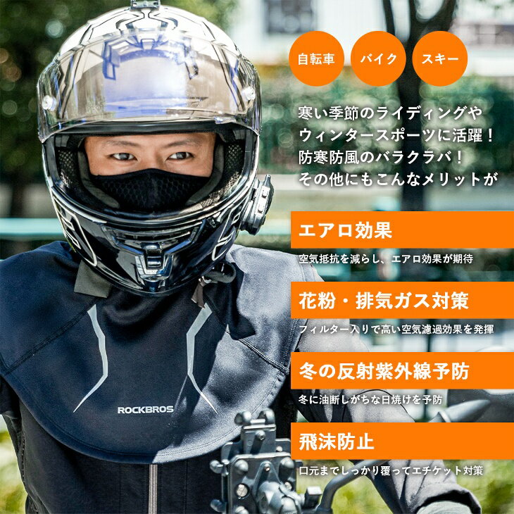 ・寒〜い秋冬シーズンのサイクリング、ツーリングに!・裏面は厚すぎず、でも暖かいライトフリース素材を使用・冷たい風をブロックして乾燥や霜焼けからお顔を守ります。・口元は透湿性に優れたメッシュ生地。息の水蒸気による冷えを防ぎますよ。・マスクのような立体縫製の口元になっているので息苦しくなくGOOD・口元裏にはフィルターポケットがついています!マスクフィルターを挿入すれば花粉やウィルス対策に・トップキャップが取り外しできる!外してフェイスカバーとしても使えます・顎下、首元は背面のドローコードでサイズ調節可能。・デザインプリントはリフレクト素材で暗い場所で光を反射!安全性を高めます【商品説明】■こんなシーンにおすすめ:サイクリング / 原付 / オートバイ / 通勤 / 通学 / 登山 / スキー / スノボ / ランニング / 配達業 / 現場作業 / サバゲー などなど…■サイズ:フリー(男性・女性にも) 詳しい寸法は商品画像内をご覧ください。■手洗い洗濯可能。 初めのうちは色落ちする可能性があります。 白い衣服を着用する際はご注意ください。 また、初めのうちは単品で洗濯してください。■付属の専用フィルターについて通常使用:最大30日間使用可能。排ガスなどが多い場所での使用:2日程度で交換を推奨。※通常使用の場合でも、嫌な臭いがしてきた・息苦しくなってきた・フィルターが破れたなどの場合はすぐに使用を中止し交換してください。※付属の専用フィルターは不織布製です。洗濯はできません。気になる場合は、フィルターにアルコールスプレーを噴射した後、天日干しして消毒してください。交換用のフィルターは別売りとなります。※交換用フィルターは現在のところ、入荷時期未定となっております。他社製のフィルターもポケットに入るサイズであれば使用可能です。関連商品フードウォーマー バラクラバ フード付き ネックウォーマー スキー ス...ROCKBROS(ロックブロス) レッグウォーマー レッグカバー サイ...ネックウォーマー 目出し帽 冬 防寒 インナーキャップ 保温 自転車 ...2,080円2,834円2,529円インナーキャップ 秋冬 裏起毛 保温 防風 防寒 自転車 つば付き サ...キャップ インナーキャップ 冬 帽子 ヘルメット バイク 自転車 防寒...ツバ付き夏用バラクラバ 接触冷感 目出し帽 紫外線カット UPF50+...1,759円1,886円2,050円インナー メンズ フリース 保温 クルーネック 防寒 丸首 冬 防風 ...首元すっきりバラクラバ 通勤通学 寒さ対策 防寒目出し帽 バラクラバ ...サイクルキャップ 吸汗 速乾 春用 夏用 接触冷感 インナーキャップ ...2,789円1,654円1,496円【送料無料】防寒・防風 ヘッドウォーマー キャップ サイクル フリース...トゥーカバー つま先 シューズカバー オーバーシューズ 自転車 春秋冬...インナーパンツ 自転車 サイクルパンツ メンズ インナーウェア 短パン...1,759円2,150円2,499円