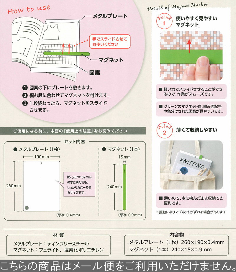図案確認のおともに!ピタッと付けてパッと分かる。『マグネットマーカー≪260×190mm≫』内容物:メタルプレート(1枚)260×190×0.4mm、マグネット(1本)240×15×0.9mm便利/クロバー/Clover/編み物/刺しゅう/