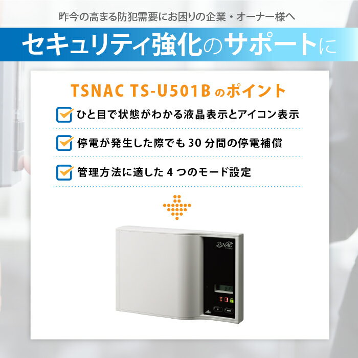 簡単操作 一目でわかる液晶表示とアイコン表示 ●液晶表示を見ながら簡単機能設定 ●液晶表示で機器の状態が一目瞭然 ●機器の通信異常を自動で判断し、液晶画面に表示 ●鍵と扉の状態と機器の異常をアイコンにより表示 メンテナンス機能の向上 ●電気錠の動作回数カウント機能メンテナンス時期の判断が容易 ●状態異常発生の回数カウント機能異常発生箇所の判断や復旧処置が容易 充実した機能 多くの便利な機能を標準で装備 ●週間タイマー機能を標準装備 ●停電復旧時のタイマー解錠制御機能 ●国内メーカーのほとんどの電気錠に対応 ●管理方法に応じた設定が可能 2線式配線で確実な施工を実現 ●2線無極性通信による省配線化と誤配線防止 ●電気錠までの配線距離150mを実現 多彩なオプション オプションの追加で広がるシステム ●バッテリー装置接続による30分間の停電補償 ●外部機器とのシステムアップ 環境配慮 ●従来品と比べて待機電力50%低減。本体容積15%削減。 スペック表 最大回線数1回線 外形 寸法215mm×145mm×44mm 材質樹脂 仕上げシボ加工 塗装色ライトグレー 質量450g 入力電源AC100V±10%50/60Hz 消費電力13W 制御方式CPU制御 LED表示 施解錠緑または赤(設定による) 開扉赤 警報橙 操作ボタン ボタン1一回解錠(Aモード)解錠/施錠(Bモード) ボタン2連続解錠(A・PAモード)解錠/施錠(B・PBモード) 解錠時間1, 5, 10, 20, 30, 60秒(Aモード時のみ) 開扉警報時間0(なし), 30秒, 1, 2, 3, 5分 タイマー解除時間3種設定(週間設定可能) 使用環境 温度0~40℃(結露無きこと) 設置場所屋内専用 ※Aモード:自動施錠モードBモード:施解錠繰り返しモードPAモード:タイマー保留付き自動施錠モードPBモード:タイマー保留付き施解錠繰り返しモード 内容物 1)コントローラー TS-U501B1台 2)TSアダプタ1台 3)取付ネジ(M3.8×20 丸木ねじ)3本 4)取扱説明書1冊【近日中に値上がりを予定しています】 アート 電気錠制御コントローラー TSNAC TS-U501B