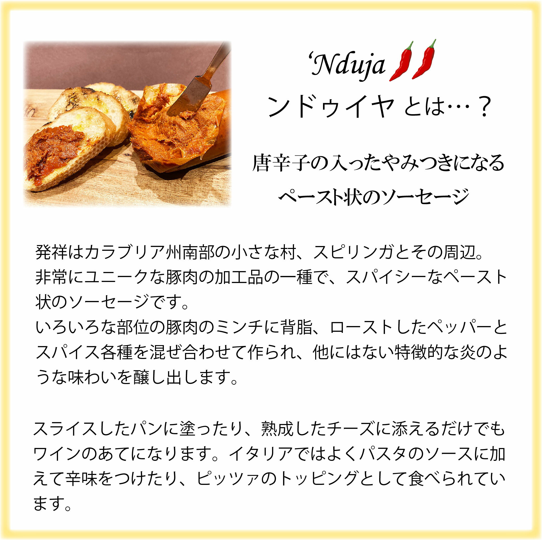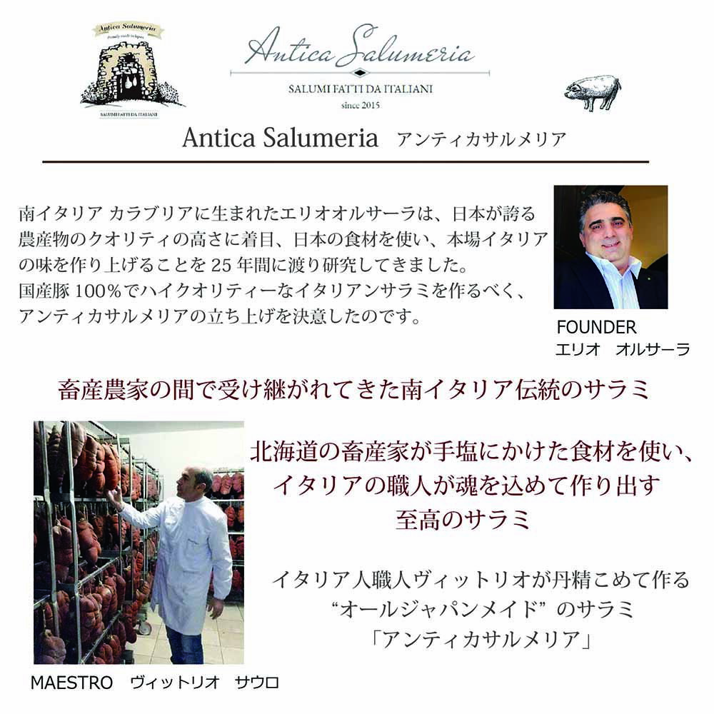 商品名 サラミソーセージ 原材料 豚脂肪(北海道産)、パプリカ、豚肉(北海道産)、チリパウダー、唐辛子、食塩、糖類(水あめ、ぶどう糖、砂糖)/酸化防止剤(ビタミンC)、発色剤(硝酸K)、香辛料抽出物 内容量 200g 保存方法 10℃以下で保存してください 賞味期限 別途記載 原産国名 日本 配送方法 クール便 冷蔵 製造者 札幌バルナバフーズ株式会社 札幌市西区八軒9条西10丁目1-37北海道の畜産家が作る\スパイシーなペースト状のソーセージ/ ◆ンドゥイヤとは? カラブリアを代表する名物ンドゥイヤ。その発祥は、イタリア・カラブリア州南部の小さな村スピリンガとその周辺です。 非常にユニークな豚肉の加工品の一種で、辛さと旨味がクセになるスパイシーなペースト状のソーセージです。いろいろな部位の豚肉のミンチに背脂、ローストしたペッパーとスパイス各種を混ぜ合わせて作られ、他にはない特徴的な炎のような味わいを醸し出します。 スライスしたパンに塗ったり、熟成したチーズに添えるだけでもワインのあてになります。イタリアではよくパスタのソースに加えて辛味をつけたり、ピッツァのトッピングとして食べられています。 ◆アンティカ サルメリア社 イタリア人職人ヴィットリオが丹精こめて作る”オールジャパンメイド”のサラミ「アンティカサルメリア」。国産豚100%でハイクオリティーなイタリアンサラミを作るべく、アンティカサルメリアの立ち上げられました。 日本が誇る農産物のクオリティの高さとその将来性に着目し、日本の食材を使い、本場イタリアの味を作り上げることを目標とし、イタリアからサラミづくりの伝統とノウハウを導入。厳選した日本の材料で本格的なイタリアンサラミを国内で作っています。 ☆アンティカ サルメリア社のサルシッチャ ピッカンテはこちら☆ 友だち追加で今すぐ使えるクーポンプレゼント中↓↓↓↓ (3,000円(税込)以上のご購入でお使いいただけます)