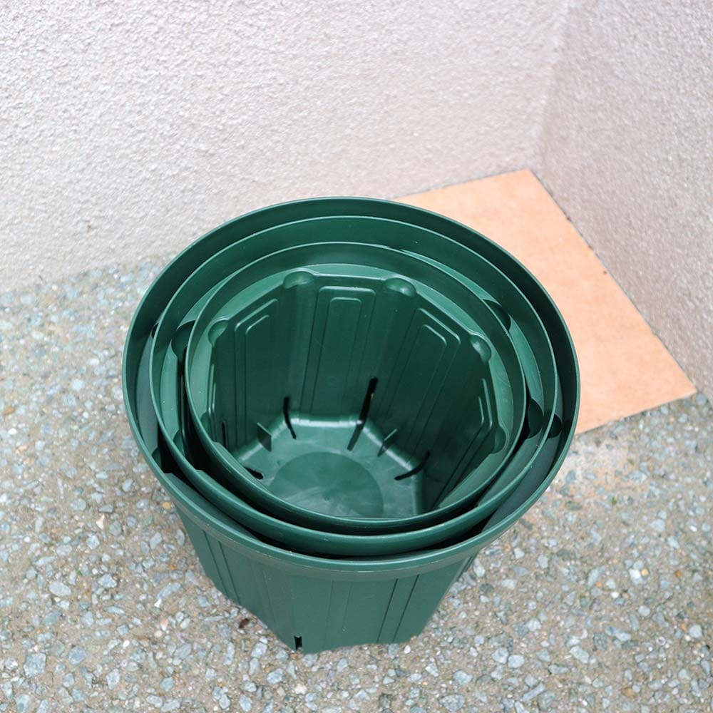 側面にまで大きいスリットが入っているので、空気に触れることを嫌う根が用土の中でバランス良く育ちます。 そのため、根の旋廻現象(サークリング)を防げます。 根詰まりしない事により、根の健康状態が良くなりますので、根だけでなく茎や葉も元気に生長します。 スリットにより、鉢底に水が溜まらず、根腐れしないので、根量が多くなり、野菜やお花・ハーブ・果樹などが良く育ち、花や実を沢山つけます。 根詰まりせず、長期間植え替えの必要がないので、鉢上げの回数を最小限に減らすことが可能です。 軽くて丈夫ですので持ち運びが楽で、鉢の移動が用意で管理が楽になります。 また、植え替え時も中身の離脱が簡単です! 【特徴】 ・根詰まりや根腐れを防止出来る ・根張りが良くなり根・茎・葉の生長が良くなる ・根のサークリングが抑えれるので、鉢替えの回数が減らせる ・軽量ですので、鉢の移動が楽になる 【各鉢の詳細】 ■6号 サイズ:外径18.0(底径14.5)×高さ15.8cm 容量:2.5L 重量(約):90g ■7号 サイズ:外径20.5(底径17.5)×高さ18.6cm 容量:4.3L 重量(約):152g ■8号 サイズ:外径24.0(底径19.5)×高さ21.0cm 容量:6.1L 重量(約):219g ■10号 サイズ:外径30.0(底径25.5)×高さ26.5cm 容量:12.8L 重量(約):407g 【注意点】 スリット鉢を使用するときは、土の上には置かないでください。 土の上に置くと、根の生長が止まりませんので、他の根が伸びません。 レンガやコンクリート、テラスの上などに置くようにしてください。 ご家庭での使用に十分耐える強度で設計しております。 容器の厚み不足・強度不足などの理由による返品リクエストには対応しておりませんので、あらかじめご了承ください。 【検索キーワード】イタンセ いたんせ ITANSE itanse スリット鉢 すりっと鉢 植木鉢 野菜 果樹 観葉植物 花 草花 植木 栽培用 ポット プランター pot 育苗 根はり鉢 家庭菜園 ガーデニング 根腐れ 根腐れ防止 根腐れを防ぐ 根張り サークリング 園芸 プロ仕様 人気 人気鉢 おしゃれ デザイン インテリア 高品質 モスグリーン バラ栽培 バラ鉢 クリスマスローズ