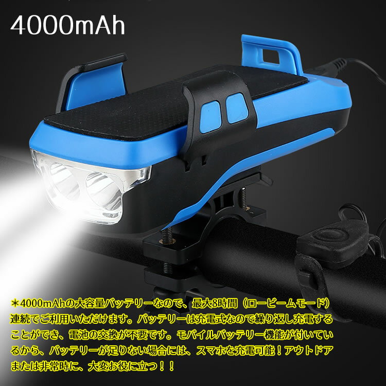 自転車ホルダーライト USB充電式 LEDヘッドライト 自転車ヘッドライト 4000mah 大容量 パワーバンク モバイルバッテリー フロントライト ホルダー 防水 スマホスタンド スマホ充電可能 高輝度 防水 懐中電灯 夜間乗り ウォーキング 登山 防災