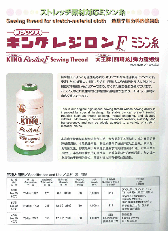 ニット等、伸び縮みする伸縮性布地専用ミシン糸。特殊加工によって可縫性を高めた、オリジナルな高速縫製用ミシン糸です。安定した撚り目は、糸割れ、糸切れ、目飛びなどの縫製トラブルを防止し、過酷な千鳥縫いもクリアーできる、すぐれた縫製機能を備えています。バランスのとれた柔軟性と伸縮性に透明度が加わり、ストレッチ素材に巾広く適応できます。 ○素材:ナイロン 100%○長さ:50番/4000m○対応針:ミシン針11番〜14番