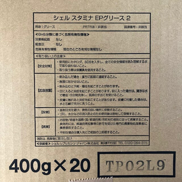 【個人宅配可!法人様も大歓迎!】 シェルルブリカンツジャパン株式会社 シェル スタミナ EP グリース 2 ちょう度2 軸受け 耐熱グリース 400g×20本入り 1ケース 非危険物 【北海道(個人様)・離島・沖縄は送料別途】