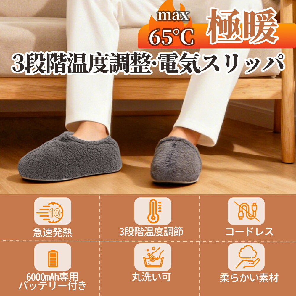 【新品発売】電気スリッパ コードレス フットウォーマー 抗菌防臭機能付き 10秒速暖 2個6000mAhバッテリー付 電気足温器 充電式 電熱スリッパ 3段階温度調節 自由に歩ける 防寒 滑り止め 柔らかい 暖かい 洗濯可能 足入れ 省エネ 足先を温めるグッズ