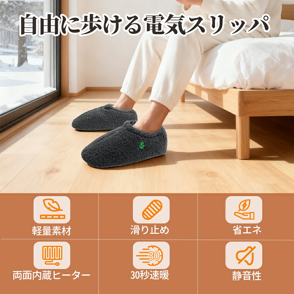 重要なお知らせ 【コードレス設計自由に歩ける電気スリッパ】 バッテリーがスリッパ本体に完全内蔵されているから、コードが邪魔にならず、普通のスリッパと同じように自由に動き回れます。 キッチンでの作業、オフィスでの移動、在宅ワーク、リビングでのくつろぎタイム、家事など、さまざまなシーンで活躍する、便利な温めスリッパです。 ダニ対策機能を搭載し、清潔で快適な履き心地を保ちます。 【大容量6000mAhバッテリー2個付き】 6000mAhの大容量バッテリーを2つ内蔵し、付属のUSBケーブルで簡単充電可能。 電源オンからわずか10秒で温かさを実感でき、最大65℃の快適な温もりがつま先から足の甲まで全体を包み込みます。 安全面でも安心の過熱保護機能を搭載。 高温モードで約3.5時間、中温で約4.5時間、低温使用時は約5.5時間と、長時間にわたって安定した暖かさを持続します。 【3段階温度調整&速暖フットウォーマー】 足元の冷えをしっかりケアするために開発されたこだわりの保温設計。 足裏全体はもちろん、指先まで包み込むように温まる高性能ヒーターを搭載。 わずかな時間でムラなく広がる心地よい温かさが、足元全体を効率的にほっこりと温めます。 温度は高(約60-65℃)・中(約50-55℃)・低(約40-45℃)の3段階調整することができます。 冬の冷えが気になる季節や、オフィスでの足元冷え対策に最適です。 【省エネ&丸ごと洗う可能】 冬の理想的な暖房アイテム!さらに、省エネ電気スリッパで、ご家庭の電気代を気にせずお使いいただけます。 万が一お手入れの際もご安心ください。 バッテリーを取り出した後、ケーブルをポケットに収納してファスナーを閉めて、スリッパ全体は洗濯機や手洗いできます。 日々の清潔を快適に保てるので、便利で衛生的です。 【男女兼用&アフターサービス】 シンプルな菱形柄が施されたポリエステルデザインで、男性も女性も気兼ねなく使用できるタイプです。Lサイズ(23~26.5cm)。 自分用はもちろん、足元が冷えることで悩んでいる友人や、ご高齢のご家族へのプレゼントとしても最適で、届けたい温もりを伝えられます。 商品到着後、サイズ不合わせ、素材に不具合がある場合や、配送中の破損が発生した場合は、「注文履歴」よりご連絡ください。 当店は迅速に返品・交換手続きを対応いたします。