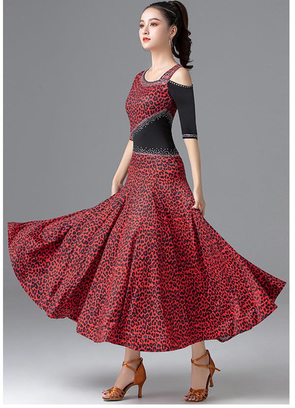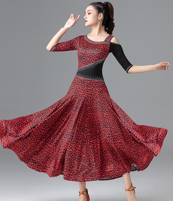 社交ダンス ドレス 初心者 社交ダンス衣装 ワンピース レディース モダン スタンダード ルンバ レッスン着 広がる裾 ヒョウ柄 ワルツ専用 大合唱 競技着 練習着 演出用 開場ドレス 練習競技着デモ用 発表会 ストレッチ 団体 レッド 赤 M L XL 2XL
