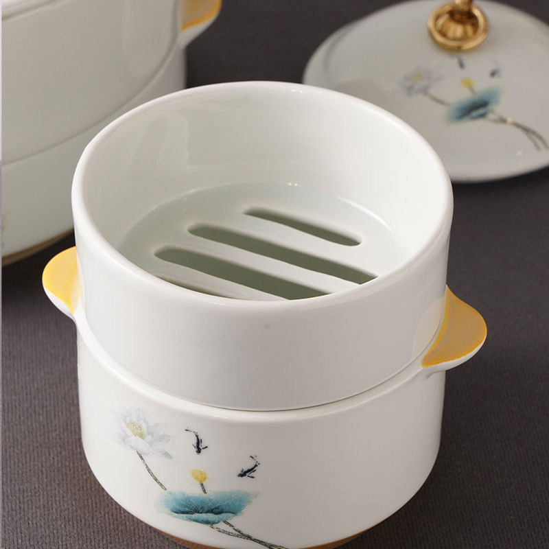 IwaiLoft 手作り せいろ 2段 セット 陶磁器 懐かしい 白蓮と魚柄 中華せいろ 蓋付 セット 持ち手付き 本格せいろ 陶磁製 高級感 セイロ 蒸し器 蒸篭 蒸籠 ヘルシー 点心 小籠包 しゅうまい おこわ 蒸し料理 蒸玉 温野菜 茶わん蒸し 電子レンジ レストラン ホテル 来客用