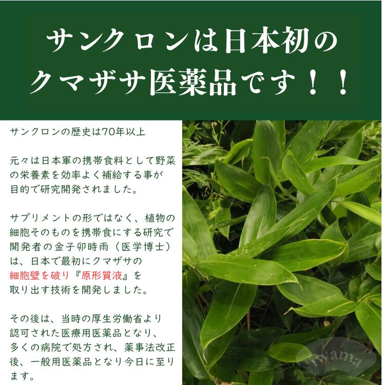 商品名 サンクロン 内容量 120ml×6本 特徴 サンクロンは、信州の高山地帯に自生するイネ科のクマザサの生葉より樹脂を除去し、細胞膜を破壊後、細胞原形質を可溶性にした濃緑色の水溶液です。 新鮮なクマザサの生葉のみを原料とし、有機溶媒(エチルアルコールやエーテル等)を一切使用せずに原形質液を抽出しているのが特徴です。 サンクロンは1954年(昭和29年)に⽇本で初めてクマザサを原料にした医薬品として承認されて以来、有機溶媒を使わない加⽔分解法による体に優しい製法を守っています。 また、防腐剤・着⾊料・酸化防⽌剤を使わず、そのままのクマザサを⼤切にしております。 使用上の注意 ◆相談する事 1.次の人は使用前に医師、歯科医師、薬剤師又は登録販売者にご相談ください ●医師・歯科医師の治療を受けている人 2.服用後、発疹・発赤・かゆみ・吐き気・嘔吐・便秘・下痢の症状が現れた場合は、副作用の可能性があるため服用を中止し、医師、歯科医師、薬剤師又は登録販売に相談してください 効能・効果 食欲不振、疲労回復、口内炎、歯槽膿漏、口臭・体臭の除去 ●歯槽膿漏は歯周病ともいわれています 用法・用量 1回2~3mLを 水 、 お茶 、 牛乳 などでうすめて、1日数回服用します 小児は半量です 症状により倍量に増量しても結構です (1)定められた用法・用量を守ってください (2)小児に服用させる場合には、保護者の指導監督のもとに服用させてください 成分・分量 サンクロンは銅クロロフィンナトリウムを0.23-0.27%含有しています。 1.本製品はクマザサ生薬を原料とした医薬品ですから、製品により多少味や匂いが異なることがありますが、品質及び効果は変わりありません 2.服用後、便が緑色になる場合がありますが、銅クロロフィリンナトリウム(緑色)が排泄されるためで心配ありません ●規格● 比重:1.020-1.024 pH:7.3-7.4 保管及び取り扱い上の注意 (1)未開栓の製品は、直射日光の当たらない、湿気の少ない涼しい所に保管してください (2)一度開栓した製品は、品質保持のために冷蔵庫に保管し、開栓より2ヶ月以内に服用してください (3)凍結させないようにして保管してください -5℃以下になると凍結し、容器が破損することがあります (4)小児の手の届かない所に保管してください (5)他の容器に入れ替えないでください (誤用の原因になったり、品質が変わることがあります) (6)使用期限の過ぎた製品は、服用しないでください (7)服用後は、瓶のフタをしっかりしめてください 問い合わせ先 ●いわま薬局 06-6691-3464 (平日10:30~16:30) お問い合わせフォーム(24時間365日) ●株式会社サンクロン 0268-42-2585 (平日9:00~16:00) e-mail uedaf@sunchlon.co.jp 広告文責 いわま薬局 大阪府大阪市住吉区3‐7‐2 06‐6691‐3464 製造販売元 株式会社サンクロン 〒386-0412 長野県上田市御嶽堂884 区分 日本製 医薬品:第3類医薬品
