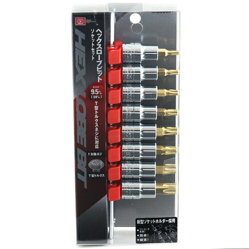 用途 T型トルクスネジの締め付け・緩め作業。 機能・特徴 新型ソケットホルダーを採用しておりますので、ワンタッチ操作で簡単にソケットを取り外せます。 新型ソケットホルダーで、確実にソケットを取り付けられます。 T型トルクスネジに対応しております。 素材には優れた強度・耐衝撃性を持つクロームバナジウム鋼を使用しております。 仕様 ●差込角:9.5mm(3/8インチ)。 ●サイズ内容:T20・T25・T27・T30・T40・T45・T50・T55。 ●対象ネジ:T型トルクスネジ。 ●クリップ色:赤。 ●ソケットホルダー付。 注意事項 ボルト・ナットはサイズに合ったものをご使用下さい。 ソケットはボルト・ナットに対して斜め掛けや浅掛けをしないよう、奥まで完全に差し込んでご使用下さい。 角ドライブは根元まで完全に差し込んで下さい。