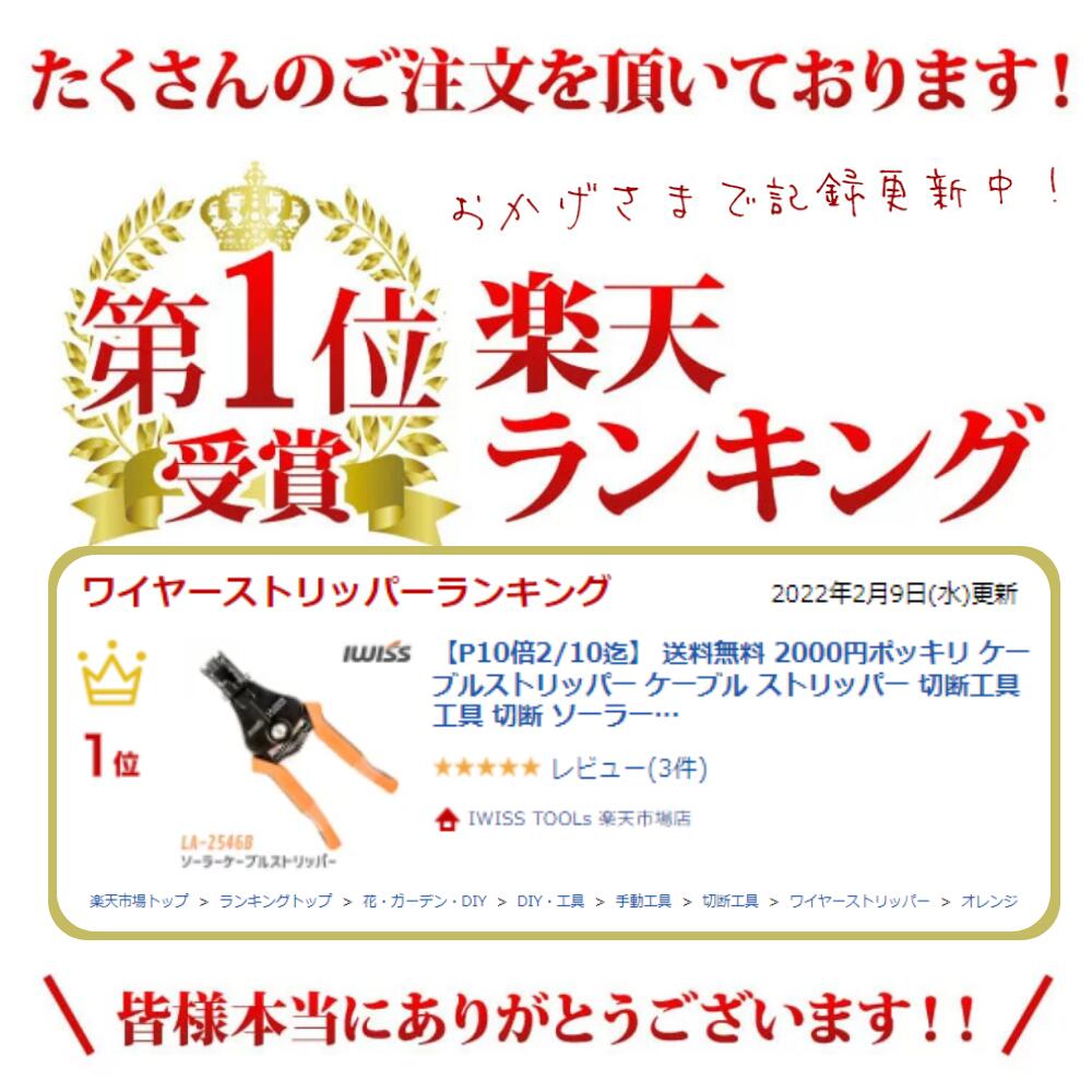 関連商品はこちら 型番LA-2546B対応電線2sqや3.5sq、5.5sqのH-CVやPV-CC、ソーラーケーブルに対応ストリップサイズ0.5-6.0sq (20-10AMG)全長175mm重量320g用途4.0sqはもちろん、2.0sqや6.0sqのソーラーケーブルも綺麗にストリップ。太陽光発電用ケーブルの皮むきに最適なケーブル ワイヤーストリッパー 皮むきです。特徴・ストリッパーサイズマーカー ストリッパー部に対応電線サイズのマーカー付き。サイズ確認が容易で作業効率アップ! ・4枚刃方式 従来のワイヤーストリッパーと違い、4枚刃方式によるストリッパーなのでチャック痕無し。 ・H-CV線・PV-CC線用ハンドストリッパー 刃はダイヤモンド精密砥石研磨により高精度の剥離を実現しました。頑丈で切れ味鋭い抜群! 全パーツはオイル焼き入れ焼き戻し処理済みの特殊鋼製。 ・ハンドルは軽量PP、TPRのグリップ。手によくフィットし、取り扱いも簡単なので初心者にも扱えます。滑り止め付きの為、手から落ちにくく安全です。使用方法STEP 1:電線幅の確認 幅をノギスで計測することができない場合、電線をストリップ穴から順に太さを確認します。 STEP 2:ケーブルをカット 使用目的に合わせてケーブルをカットしてください。 STEP 3:場所決め 絶縁被覆を剥ぎたい位置にワイヤーストリッパーの刃を当てます。 STEP 4:被覆部のストリップ グリップを少し緩めた状態で左手の親指で軽くストリッパーを押すと簡単にストリープできます。注意・硬い材質、ピアノ線などの切断に使用しないで下さい。 ・感電の恐れがありますので、活線作業は行わないで下さい。 ・安全の為に保護メガネを着用して作業して下さい。切断物が飛び散りますので、周囲に人や壊れやすい物がないことを確認してから作業して下さい。 ・両端のボルトとナットを締めて隙間を調整しないで下さい。セットピンが破損する原因となります。ブランドIWISS/アイウィス