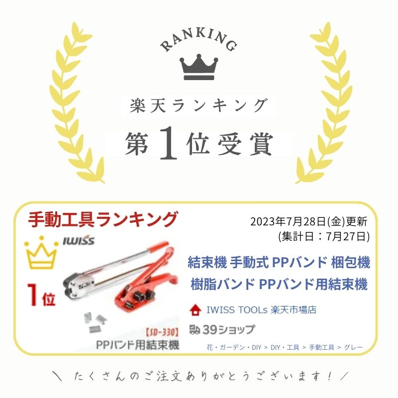 関連商品はこちら 型番SD-330(SEAL200)ブランドIWISS アイウィス商品概要PPバンド・エステルバンド・ヘビーバンド用強力巻き取り式引き締め機・封緘機SD-300 PPバンド用シール200点も付属しているおトクなセット品寸法・封緘機:H85xL500mm ・結束機:H26xL270mm重量・封緘機:1.4kg ・結束機:1.6kg結束方法ドラム式・ラチェット機構バンド材質ヘビーバンドやA級、B級PPバンド等の樹脂製バンドに使用バンド幅・封緘器:16mm/13mm ・結束器:13-19mm以内バンド厚み0.4-0.9mm付属品バンドシール200個(16mm幅用)、取扱説明書製品特徴・ドラム巻き取り式のため強力な引き締めが可能。 ・PPバンドからエステルバンド・ヘビーバンドまであらゆるプラバンドの引き締めに対応 。 ・t0.4〜0.9mm、幅19mmまで対応。 (※封緘器の対応幅は16mm迄となりますのでご注意ください) ・カッター付きのため作業抜群。 ・軽量&安全設計:本機は特殊合金使用のため軽量且つ指を挟みにくい安全設計で使いやすい。 ・バンドシールの簡単引き締め:刃とハンドルのバランスに優れたテコ作用で負担を軽減。さらに、作業中に手が滑りにくいグリップで刃は鋭く研磨された製特殊鋼。6枚刃式で長寿命&頑丈。使用方法1.バンドを先端部を引き締め機にセット、レバーを握り固定爪を開きバンドを固定爪の下を通し先端を引き締め機の前に10cm程出します。 2.周回したバンドをカッター及び巻き取りドラムにセットします。 この時バンドの緩みを極力お取り下さい。 3.引き締めレバーを前後に操作し引き締めます。 4.シール金具を封かんします。 5.レバーを握りバンドを切断。 6.引き締めレバーを握るとすとバンドの 固定が外れますので本機を取り外し完了です。付属品バンド幅変更部品、取扱説明書注意事項・バンドは手締め用の柔らかいものに適合しませんのでご注意ください。 ・5KG以上の重さで緩んで外れる品ですので使用不可です。バンドのカットも機械式の梱包機用テープでないとカットできません。