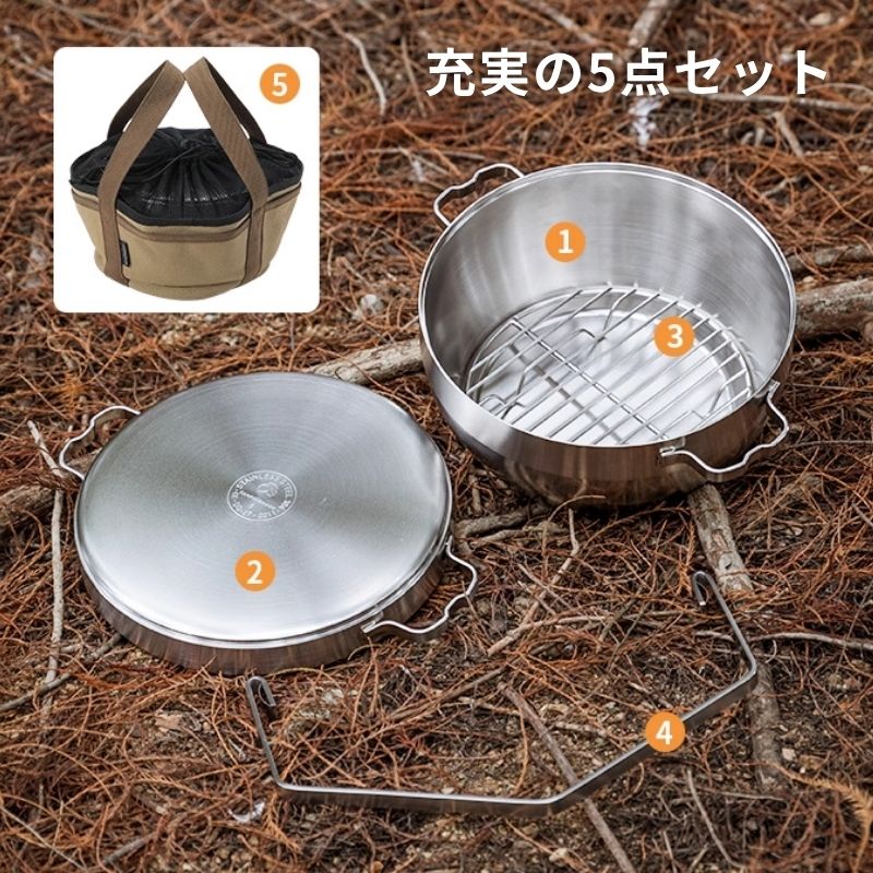 関連商品はこちら ブランドCampingmoon キャンピングムーン品名Stainless Dutch oven ステンレス ダッチオーブン 6インチ or 8インチ型番DO-25(6インチ) DO-27(8インチ)サイズ(約)■ 6インチ 本体厚さ:t 3.4mm 本体内径(底):約120mm 本体内径(開口):約150mm 高さ(蓋付き):約115mm 外形全体(補助ハンドル含む):206×156×200mm 深さ 深鍋内面より:約80mm、浅鍋内面より:約30mm ■ 8インチ 本体厚さ:t 3.4mm 本体内径(底):150mm 本体内径(開口):210mm 高さ(蓋付き):135mm 外形全体(補助ハンドル含む):270×217×240(収納時135)mm 深さ 深鍋内面より:約102mm、浅鍋内面より:30mm重量(約)■ 6インチ 2.5kg ■ 8インチ 4.15kgセット内容深鍋(ポット)、浅鍋(リッド)、ツル(補助ハンドル)、底網、帆布ケース材質18-8ステンレス特徴ステンレス製ダッチオーブン|アウトドアも自宅もこれ1台 ■ 手入れ簡単で使いやすい ステンレス製 鋳鉄製ダッチオーブンはシーズニングや油膜管理が必要で手間がかかりますが、ステンレス製なら購入後すぐ使用可能。 洗剤で洗って乾かすだけでOK、錆びにくく軽量なので初心者にもおすすめです。 ■ 自宅でも使えるフラット底面 底面がフラットな設計のため、クッキングヒーターやガスコンロでも使用可能。アウトドアだけでなく、普段の自宅調理にも活躍します。 ■ 深鍋と浅鍋の2つのセットで調理の幅広がる 深鍋と浅鍋の2種類がセットになっており、料理に合わせて使い分けが可能。重ねてコンパクトに収納できるため、持ち運びにも便利で、荷物を最小限に抑えたいキャンプやピクニックに最適。Q&AQ1. 底網は付属していますか? A. 専用底網 が1枚付属しています。 Q2. 食洗機で洗えますか? A. はい、食洗機対応です。 Q3. ダッチオーブンに付いた煤(すす)はどうやって落としますか? A. クエン酸や重曹を溶かした水で沸騰させ、火を止めて時間を置いた後、スポンジで軽く擦ると落とせます。 Q4. 使用後の手入れはどうすればよいですか? A. 普通の調理器具と同じように洗剤で洗い、乾燥させるだけでOK。錆びの心配がなく、鋳鉄製より軽量なので手軽に使用できます。 Q5. 錆びてしまった場合はどうすればよいですか? A. 表面に均一にサビが出る傾向があります。金ダワシでこすり、水で洗い落としてから乾燥させてください。濡れたままや塩分・塩素のある環境下では錆びやすいので、清潔で乾燥した場所に保管してください。メンテナンスについて使用後のお手入れ ・使用後は食器用洗剤で洗い、スポンジで軽くこすった後、水分をしっかり拭き取り乾燥させて保管 ・焦げつきや油汚れは、重曹を使ったソーダ煮で簡単に落とせます 厚い焦げは一晩漬け込んでから沸騰させると効果的 ・それでも落ちない頑固な焦げは、酢を数滴入れたお湯で沸騰させた後、冷ましてからスチールタワシで軽くこする 注意点 ・ナイフや鋭利な道具でこすって表面を傷つけない ・食器用洗剤を溶かしたお湯やステンレス用クリーム洗剤を活用 ・塩分、酸を含む汚れは早めに落とす ・異種金属との接触や湿気の多い場所での保管は避ける ・錆びが発生した場合は、ステンレス用クリーム洗剤でこすり落とし、よくすすぐ ・手の届きにくい場所に保管しない(落下防止)注意事項※ 本製品(ダッチオーブン本体)には、底網や収納ケースは付属していません。工場で一度開封し再梱包しているため、開封の形跡が残る場合があります。 ※ ガスコンロでの使用が可能ですが、IHは機種によって使用できない場合があります。料理や底網の使用で空焚き防止機能が作動することがあります。IHでの燻製調理は行わないでください。 ※ 平底設計によりガスコンロでも使用できますが、火力や鍋の中心にご注意ください。 ※ 製造ロットにより細部のデザインが予告なく変更される場合があります。 ※ 良いものをより安く提供するため、エコ梱包(プチプチ)でお届けしています。 ※ 海外輸入品のため、スレ・キズ等がある場合があります。セット内容【DO-25】6インチ【DO-27】8インチ
