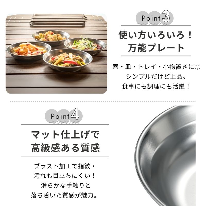 関連商品はこちら ブランドキャンピングムーン CAMPING MOON型番S395-16-4P品名ステンレス製食器プレート φ168×32mmサイズ(約)φ168×32mm重量(約)89g素材0.4mm厚18-8ステンレス 割れたり溶けたりしないのでアウトドアでも使いやすく、油汚れも落ちやすくにおいが残らないのもうれしいポイント!仕上げビーズブラスト加工(マット仕上げ)内容4枚セット注意事項※こちらは【φ168×32mm/4枚セット】の販売ページです。数量・サイズにお間違いがないようご確認ください。 ※細部のデザインは製造ロットにより予告なしに若干変更になる場合がございますので、予めご了承願います。 ※目盛りはあくまでも目安としてお考えくださいませ。 ※良いものをより安く提供できるよう、プチプチにてエコ梱包させていただいております。 ※海外輸入品に付きスレ、キズ等がある場合がございますので予めご了承ください。高品質なステンレス304製高熱でも歪みが少ない頑丈なスペック、食洗機も対応可能ビーズブラスト加工により表面のつや消しを施し、より滑らかで高級感のある質感に仕上げました。 プレートを持った時の手触りや、優しい口当たりもクセになってしまうのも特徴です。お子さまがいる際も割れる心配はなく、ステンレス製のため嫌な臭いも残りませんスタッキングできるシンプルデザイン人数分重ねてコンパクト収納! 場所を取らずスマートに持ち運べます。 ※ケースは付属していません。※こちらは【φ168×32mm/4枚セット】の販売ページです。 数量・サイズにお間違いがないようご確認ください。ソロキャンプやバイクツーリングなど、軽量でコンパクトなアウトドアギアを求める方に最適なステンレス製食器です。 取り皿や朝食用のプレートとしても使える多機能デザインで、キャンプや登山、ピクニックにぴったり。 パンやフルーツ、ちょっとしたおかずの盛り付けに適したサイズ感で、 副菜皿や取り皿としても便利に使えます。 軽量かつ丈夫なステンレス素材で、持ち運びしやすく長く使えるアウトドア食器をお探しの方におすすめ!お手入れのコツ丁寧に使っていても、どうしても汚れがついたり、一度つくと落ちにくいことがありますよね。 そんな汚れを防ぐためには、使ったらすぐに洗うことがポイントです。 すぐに洗えない場合でも、水に浸けておくだけで汚れが落ちやすくなります。 このちょっとしたひと手間が、食器を長持ちさせるコツです。 「使ったらすぐ洗う」習慣をつければ、清潔なお皿が保てるだけでなく、気持ちもすっきりしますよ。 アウトドアやキャンプでのステンレス食器のお手入れにもぜひお試しください。SIZE