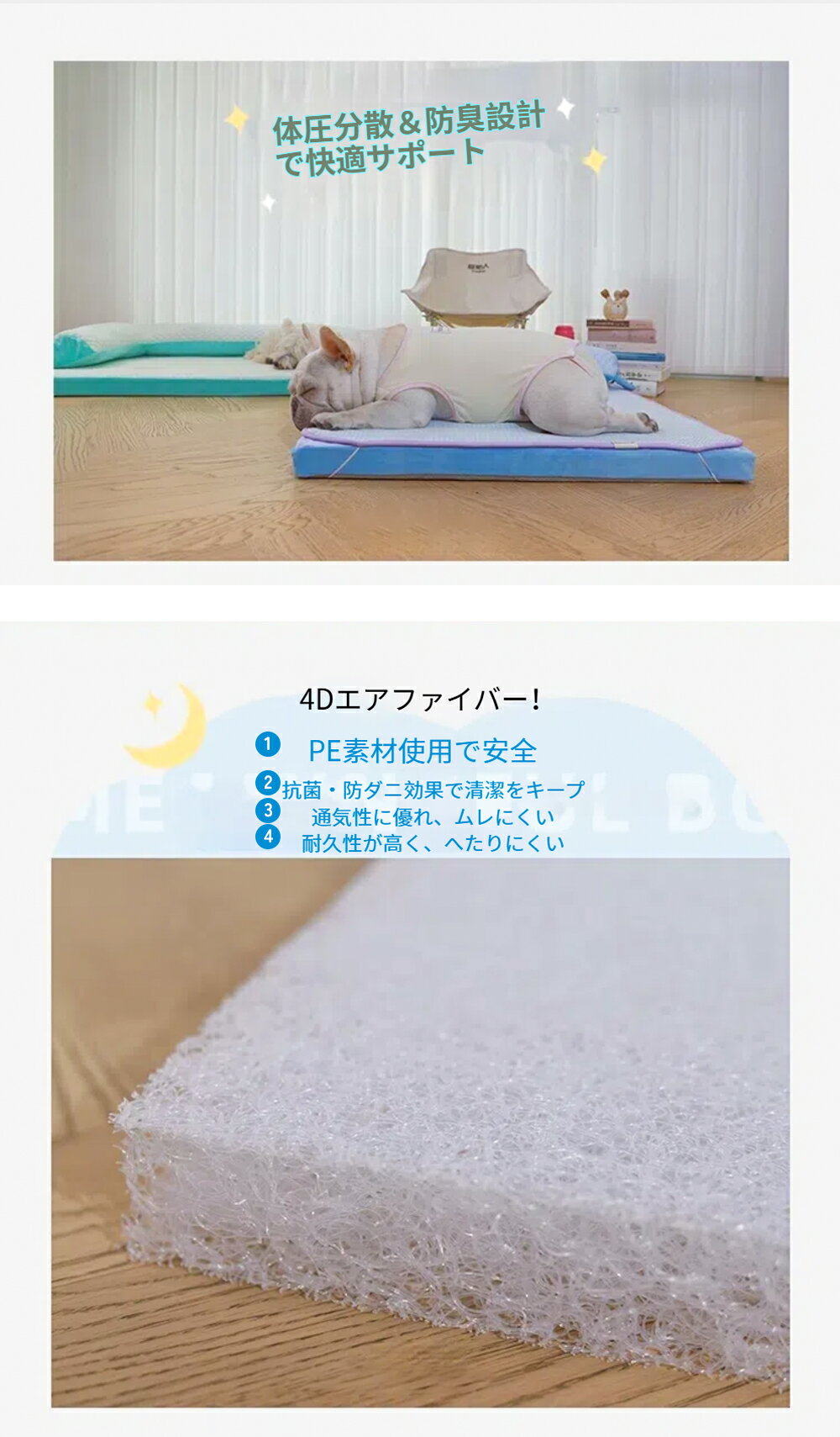 なぜこのペット介護マットを選ぶのか?「愛犬が年を取り、関節の痛みでつらそう…」「寝ているときに漏尿してしまうけど、どうしたらいい?」 そんな悩みを抱える飼い主さんのために、このペット介護マットは誕生しました。 赤ちゃんのために開発された護脊ベビーマットをベースに、愛犬の体に最適な仕様に改良。 高品質な素材と優れた設計で、愛犬の快適な眠りと健康を支えます。特徴1、ベビーグレードの安全素材:素材には4Dエアファイバーを使用。PE素材(食品用ラップや保存袋にも使われる安全なプラスチック)で、通気性抜群。菌やダニの繁殖を抑え、カビも防ぎます。 2、丸洗いOK&速乾:マット+カバー+枕の3点セットはすべて取り外し可能で、お手入れも簡単。尿漏れが気になるシニア犬にも安心。 3、均一な支えで関節を守る:高反発素材で愛犬の体をしっかり支えます。重い犬でも沈み込みにくく、脊椎や関節への負担を軽減します。(東京大学の博士も推薦! 愛犬の健康を考えた設計で、シニア犬にもぴったりです。) 4、夏にぴったりの接触冷感カバー:外カバーにはひんやり冷感素材を使用。暑い季節でも快適に過ごせます。 5、隠しファスナー設計:噛み癖のある犬でも安心!ファスナーは隠れる仕様で、ペットが噛みつきにくく工夫されています。ユーザーの声「シニア犬になり、関節の痛みがひどくなってきましたが、このマットを使い始めてからはぐっすり眠れるようになりました!漏尿してもすぐに洗えて清潔を保てるので安心です。」愛犬への思いやり年齢とともに関節が弱り、寝姿勢による体への負担が増えていきます。 このペット介護マットは、赤ちゃんと同レベルの安全性と快適さで、愛犬の健康を守ります。 この夏、大切な家族にベビー級のケアを関連商品はこちら犬 枕 まくら 介護用 まくら 棉100 小/...