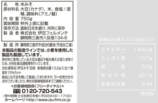 ★『伊豆みそ』のおいしさをそのままに、塩分を15%カットした減塩タイプ。糀歩合(米と大豆の重量比)は10割。食塩相当量は9.4gです。なめらかな口当たりで香り高く、ほんのり甘い味わいです。田舎みそは、濾していないので大豆の粒々感を味わうことが出来ます。 ★従来の工程を2つも増やした製法へのこだわり!! 美味しさで地元に根強い支持をいただいている「伊豆みそ」の味を継承しつつ、さらに減塩タイプの商品にしました。減塩のための微細な発酵コントロールを調整し、発酵を促し膨張を抑制させた製法を確立しました。一手間二手間かけて、さらに美味しい減塩タイプの伊豆みそです。 ※賞味期間 製造日より120日 ・みそは袋詰め後も熟成しており、変色が進みますが、品質には問題ありません。お買い上げ後は冷蔵庫へ保管していただくと変色が防止できます。