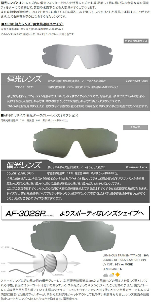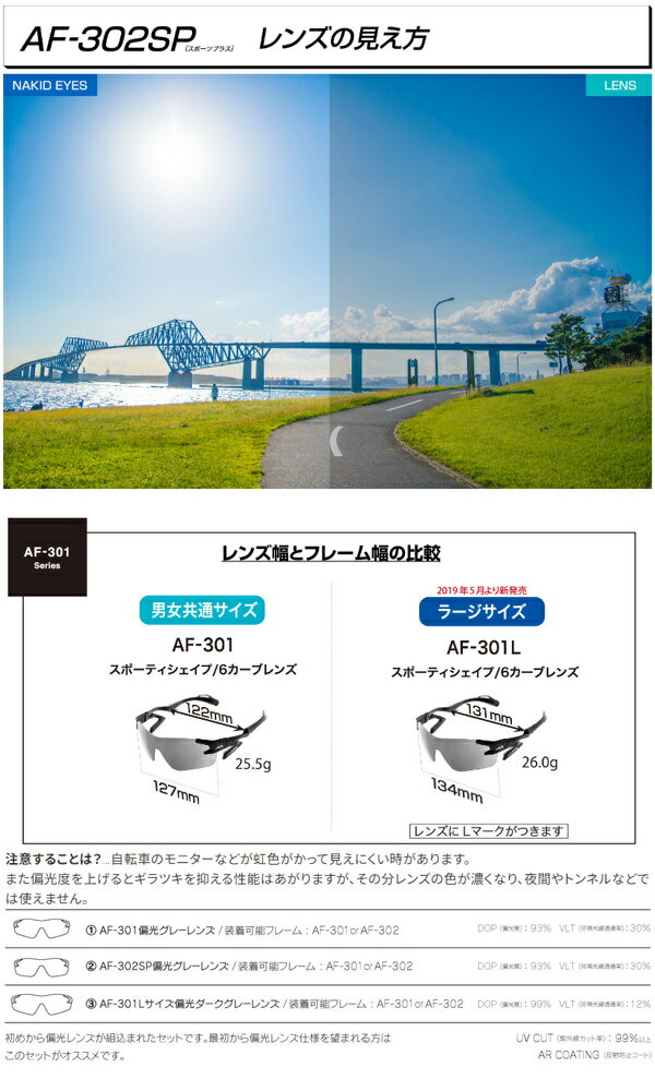エアフライ AF302 シリーズはこちら AF-302 AF-302 ラージサイズ AF-302 偏光レンズ AF-302 調光レンズ AF-302 標準レンズ単品 AF-302 ミラーレンズ単品 AF-302 偏光レンズ単品 エアフライ シリーズはこちら AF-301 ユニセックスモデル AF-302 女性向けモデル AF-501 アウトドア カジュアル AF-303 ユニセックスモデル AF-304 女性向けモデル AF-305 小顔な方向け AF-305 CYMT 幅広な顔立ちの方向け AF-305 CYSP CMYTよりレンズが一回り小さいモデル AF-801 ブルーライトカット30%レンズ AF-901 キッズ AF-402 普段使いしやすいモデル エアフライ AF-302 P 偏光レンズ組込みセットノーズパッドレス スポーツ サングラス スポーツプラス AirFly ジゴスペック ZYGOSPEC まるで掛けていないかのような最高のフィット感を実現した"エアフライ"。 鼻パッドを無くしてサイドパッドによるホールドで鼻骨への圧迫感を排除し、今までのサングラスで度々起きていた鼻パッドが鼻汗で滑り落ちることがエアフライでは起こらずにとてもずれにくく、長時間装着がストレスにならないメリットがあります。 従来のサングラスのような鼻パッドによる視界内でのチラつきがなく、今まで経験したことないようなクリアーで広々とした視界をもたらします。また鼻パッドがないため、走行中に鼻のところからのフレッシュな空気の取り入れられ、レンズ裏の湿った空気を押し出しレンズ外へ排出されます。このようにエアフライはレンズが曇りにくいことも特長です。 エアフライは女性にも大変やさしいサングラスです。鼻パッドがないので鼻に痕がつくことはありません。今まで鼻についてきたあの赤い痕とは無縁です。また鼻パッドによるメイクやUVクリーム剥がしも起こりません。あなたの美肌を保ちます。 エアフライはやや前に出して掛けることも可能です。鼻でかけないためサングラスの前後の装着具合を自在に決められます。例えばまつ毛がレンズに当たって困っていた方も、このエアフライでは少し前出しで装着することでまつ毛が当たらなくなり問題ありません。 鼻でとめないので鼻が低い方でも問題なく装着可能。鼻が低くてなかなか顔に合うサングラスが見つからなかった方にぜひ掛けていただきたいです。 エアフライは眼鏡の国内生産95%を誇る鯖江から誕生しました。110年以上の眼鏡作りで培った経験とノウハウを注ぎ込み作られら画期的なスポーツサングラス "エアフライ"をスポーツを愛するアスリートの方へ鯖江よりお届けします。 SPは[スポーツプラス]を意味します。AF-302SPは、スポーティな女性に似合うレンズシェイプに仕上げました。 【機能】 紫外線カット率99%以上 ARコーティング 反射防止コート 【AF-302SP フレーム】 C-1:クリアーグレー C-4:ピンク C-5:パールホワイト C-32:エメラルドグリーン C-34:クリアーアッシュ C-35:アクアブルー 【レンズ】 ■AF-301 偏光レンズ グレー / VLT(可視光線透過率):30% / DOP(偏光度):93% ■AF-301 Lサイズ 偏光レンズ ダークグレー / VLT(可視光線透過率):12% / DOP(偏光度):99% ■AF-302SP 偏光レンズ グレー / VLT(可視光線透過率):30% / DOP(偏光度):93% ■AF-302SP 偏光レンズ ハイコントラストローズレンズ / VLT(可視光線透過率):14% / DOP(偏光度):99% ※すべてAF-302SPフレームに装着可能 形状、サイズが違いますのでよくご確認ください。 ※フレームと偏光レンズの組み合わせの選択が可能です。オプションよりご選択ください。 在庫表記・発送についてエアフライ AF302 シリーズはこちら AF-302 AF-302 ラージサイズ AF-302 偏光レンズ AF-302 調光レンズ AF-302 標準レンズ単品 AF-302 ミラーレンズ単品 AF-302 偏光レンズ単品 エアフライ シリーズはこちら AF-301 ユニセックスモデル AF-302 女性向けモデル AF-501 アウトドア カジュアル AF-303 ユニセックスモデル AF-304 女性向けモデル AF-305 小顔な方向け AF-305 CYMT 幅広な顔立ちの方向け AF-305 CYSP CMYTよりレンズが一回り小さいモデル AF-801 ブルーライトカット30%レンズ AF-901 キッズ AF-402 普段使いしやすいモデル エアフライ AF-302 P 偏光レンズ組込みセットノーズパッドレス スポーツ サングラス スポーツプラス AirFly ジゴスペック ZYGOSPEC まるで掛けていないかのような最高のフィット感を実現した"エアフライ"。 鼻パッドを無くしてサイドパッドによるホールドで鼻骨への圧迫感を排除し、今までのサングラスで度々起きていた鼻パッドが鼻汗で滑り落ちることがエアフライでは起こらずにとてもずれにくく、長時間装着がストレスにならないメリットがあります。 従来のサングラスのような鼻パッドによる視界内でのチラつきがなく、今まで経験したことないようなクリアーで広々とした視界をもたらします。また鼻パッドがないため、走行中に鼻のところからのフレッシュな空気の取り入れられ、レンズ裏の湿った空気を押し出しレンズ外へ排出されます。このようにエアフライはレンズが曇りにくいことも特長です。 エアフライは女性にも大変やさしいサングラスです。鼻パッドがないので鼻に痕がつくことはありません。今まで