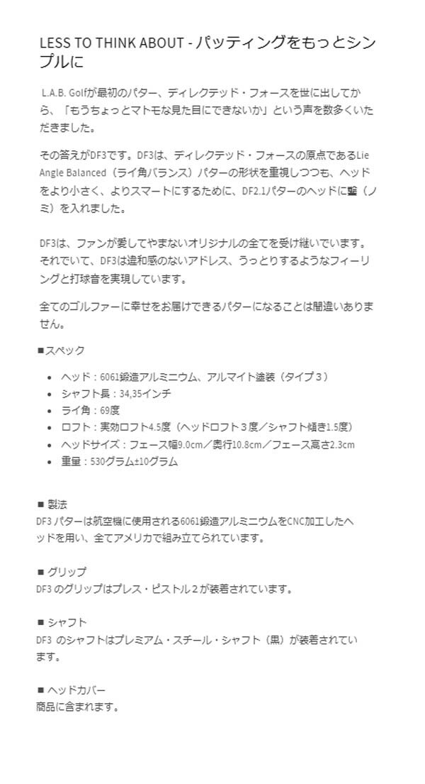在庫表記・発送についてL.A.B. Golfが最初のパター、ディレクテッド・フォースを世に出してから、「もうちょっとマトモな見た目にできないか」という声を数多くいただきました。 その答えがDF3です。L.A.B. Golfの原点であるDF2.1 の形状を重視しつつも、ヘッドをより小さく、よりスマートにするために、DF2.1パターのヘッドに鑿(ノミ)を入れました。 DF3は、ファンが愛してやまないオリジナルの全てを受け継いでいます。 それでいて、DF3は違和感のないアドレス、うっとりするようなフィーリングと打球音を実現しています。 世界初のトルクフリーパターで アダムスコットやルーカスグローバーなども使用している。
