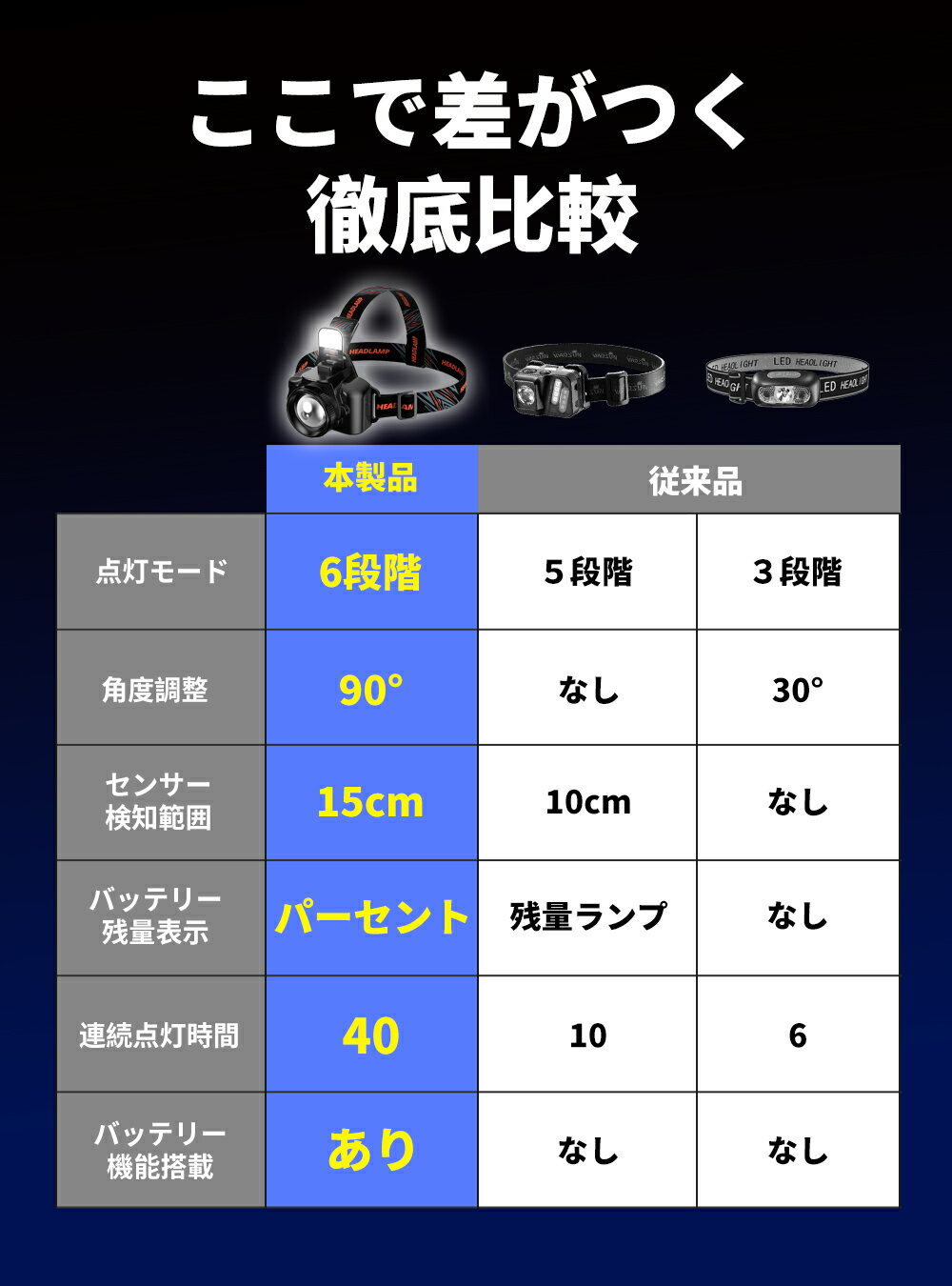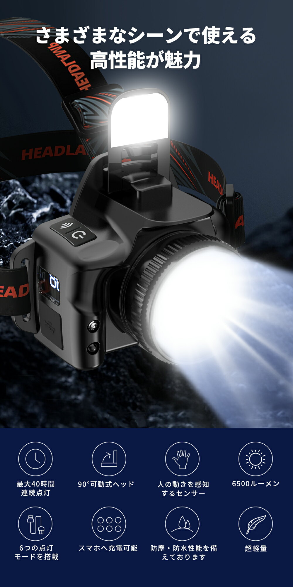 【クーポン+P5で1,870円】ヘッドライト 充電式 LEDヘッドランプ ヘッド ライト 40時間点灯 センサー機能 高輝度 6モード 明るい ヘッドランプ ledヘッドライト USB充電式 防水 電池残量表示 アウトドア キャンプ 登山 防災 サイクリング ハイキング 小型 軽量 懐中電灯