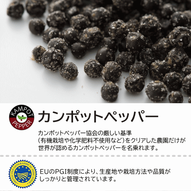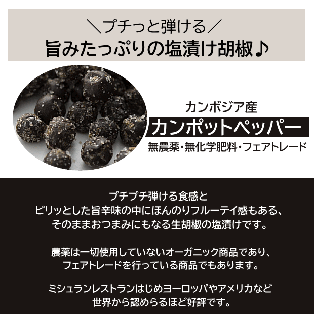 ◆ details * 原材料 有機胡椒、食塩 内容量 100g 賞味期限 ※今回入荷分2028年1月迄 保存方法 直射日光・高温多湿を避けて常温保存してください。(開封後はしっかり封してしてください。) 説明 ◎旨みたっぷりの無農薬・塩漬け生胡椒♪ ◆完全無農薬のオーガニック栽培で育った世界最高品質のカンボジア産カンポットペッパーです。ほんのりフルーティな、上品な辛さと旨みの強さがあります。また天然塩で漬けていて、適度な塩加減で旨みを最大限に引き出しており、おつまみとしても美味しい仕上がりになっております。 ☆絶品の生粒胡椒♪ ミルで挽く必要もなく、そのまま食べられますので、自宅ではもちろんキャンプ飯などにも手軽に使えます。こだわりの生胡椒!是非お試しを!◆世界最高品質の食べる粒胡椒♪ 塩漬け胡椒 ◎旨みたっぷりの無農薬・塩漬け生胡椒♪ *完全無農薬のオーガニック栽培で育った世界最高品質のカンボジア産カンポットペッパーです。ほんのりフルーティな、上品な辛さと旨みの強さがあります。適度な塩加減で旨みを最大限に引き出しており、おつまみとしても美味しい仕上がりになっております。 *ミルで挽く必要もなく、そのまま食べられますので、自宅ではもちろんキャンプ飯などにも手軽に使えます。 ☆絶品の生粒胡椒♪ ▼カンポットペッパー・塩漬け胡椒の完成まで▼ ◎たっぷり使える、大容量! こだわりのプチッ旨っ胡椒を是非お試しあれ